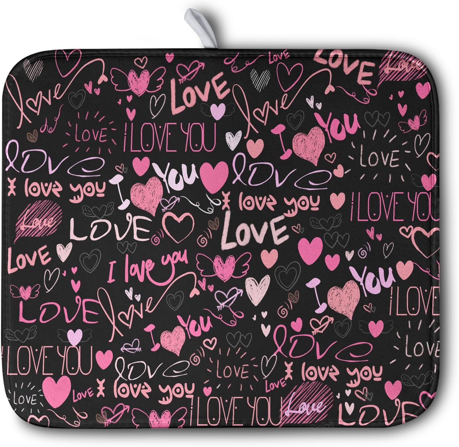 Mother's Day Dish Drying Mat for Kitchen Counter Love Heart Black Drying Mats Absorbent Reversible Microfiber Dish Pad Washable Dish Draining Mat Extra Large 16x18 inch
