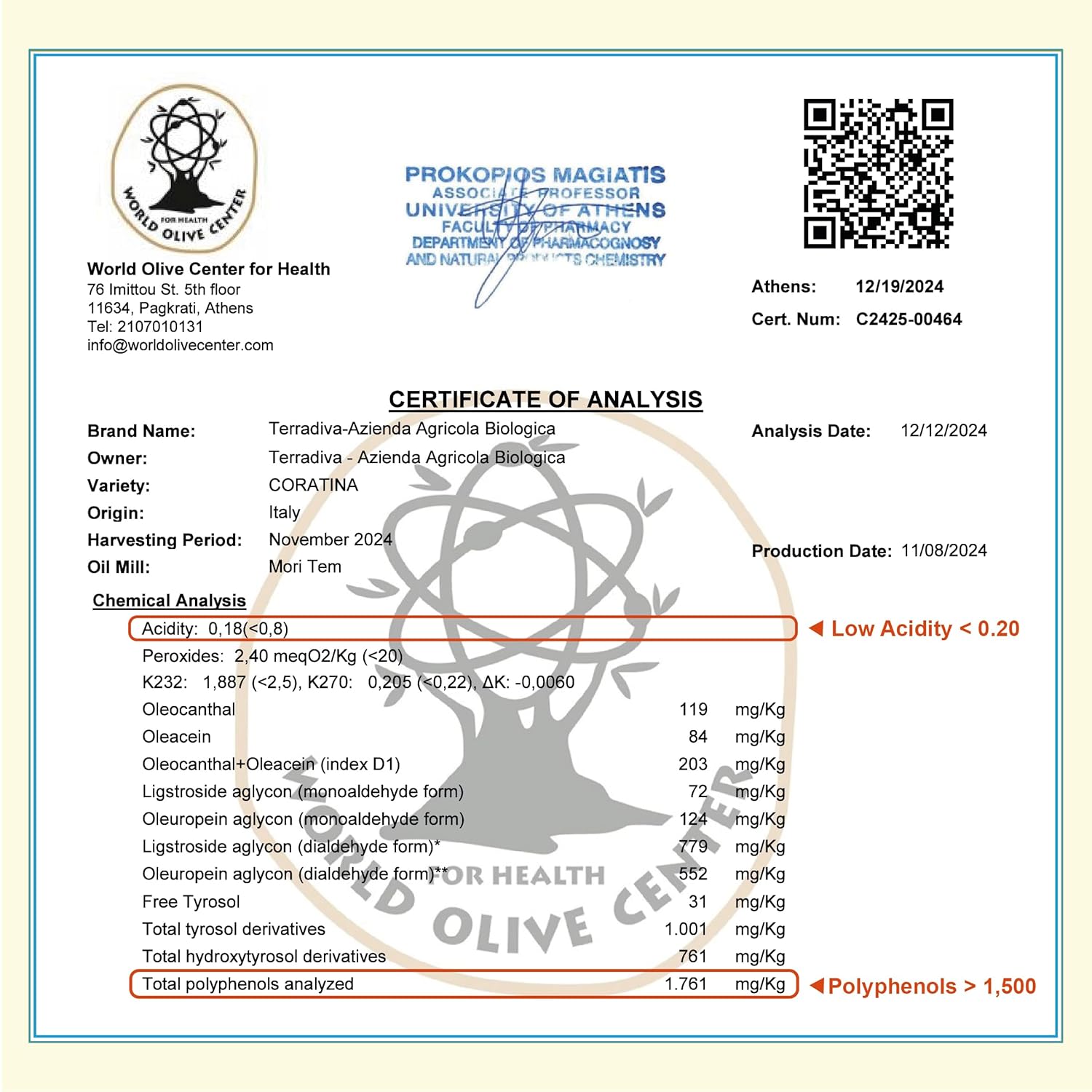 - Gold Award - 2025 NYIOOC Gold Award, Single family artisanal estate producer, ranked among top olive oil producers in prestigious Flos Olei Guide; USDA Certified Organic Extra Virgin Olive Oil; lab tested 100% free from pesticides
