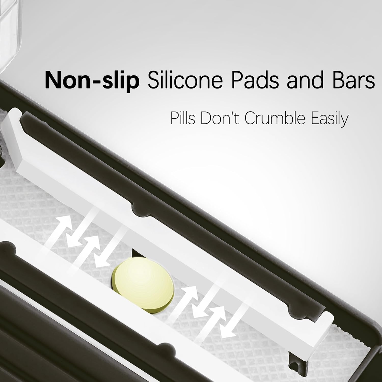 - 【Not Easy to Crumble】Pill splitter with centering device has 2 non-slip silicone bars and a silicone backing to cushion the squeeze and make the cut more evenly, won't crumble the pills lightly