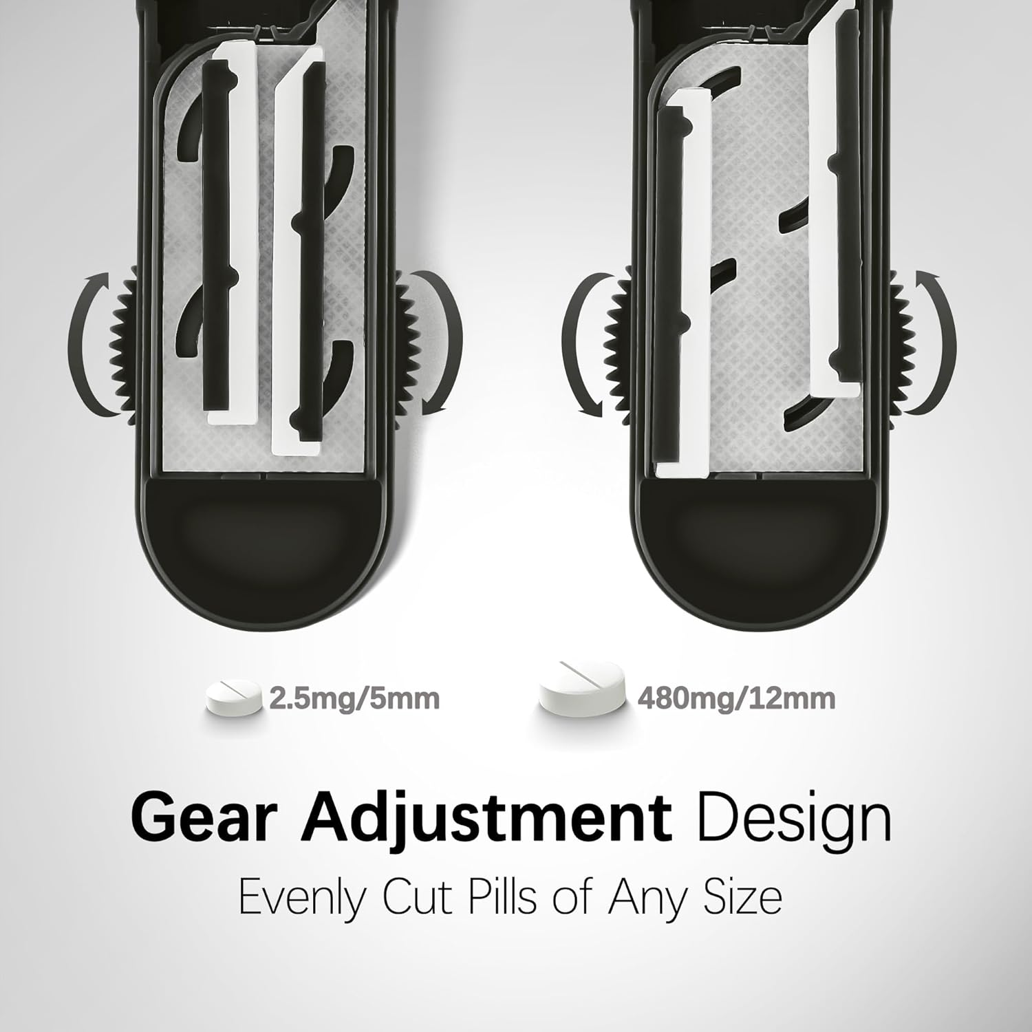 - 【Easy to Use】You just need to arrange the pills neatly on the pill cutter, make sure the pills are placed in the center, rotate the adjustable gear of the pill cutter to avoid the pills from sliding, and then press the lid to cut multiple pills into 1/2 or 1/4