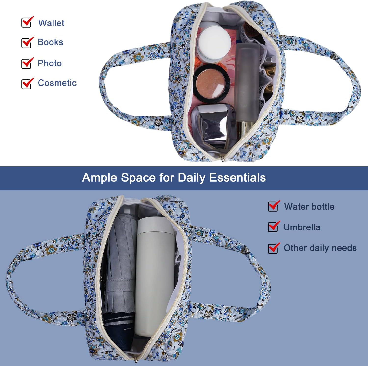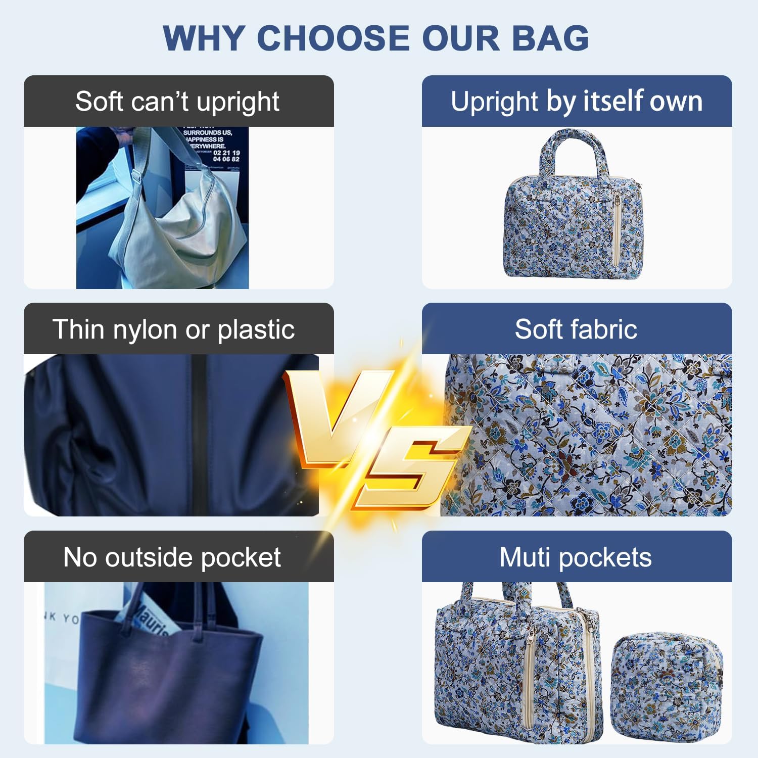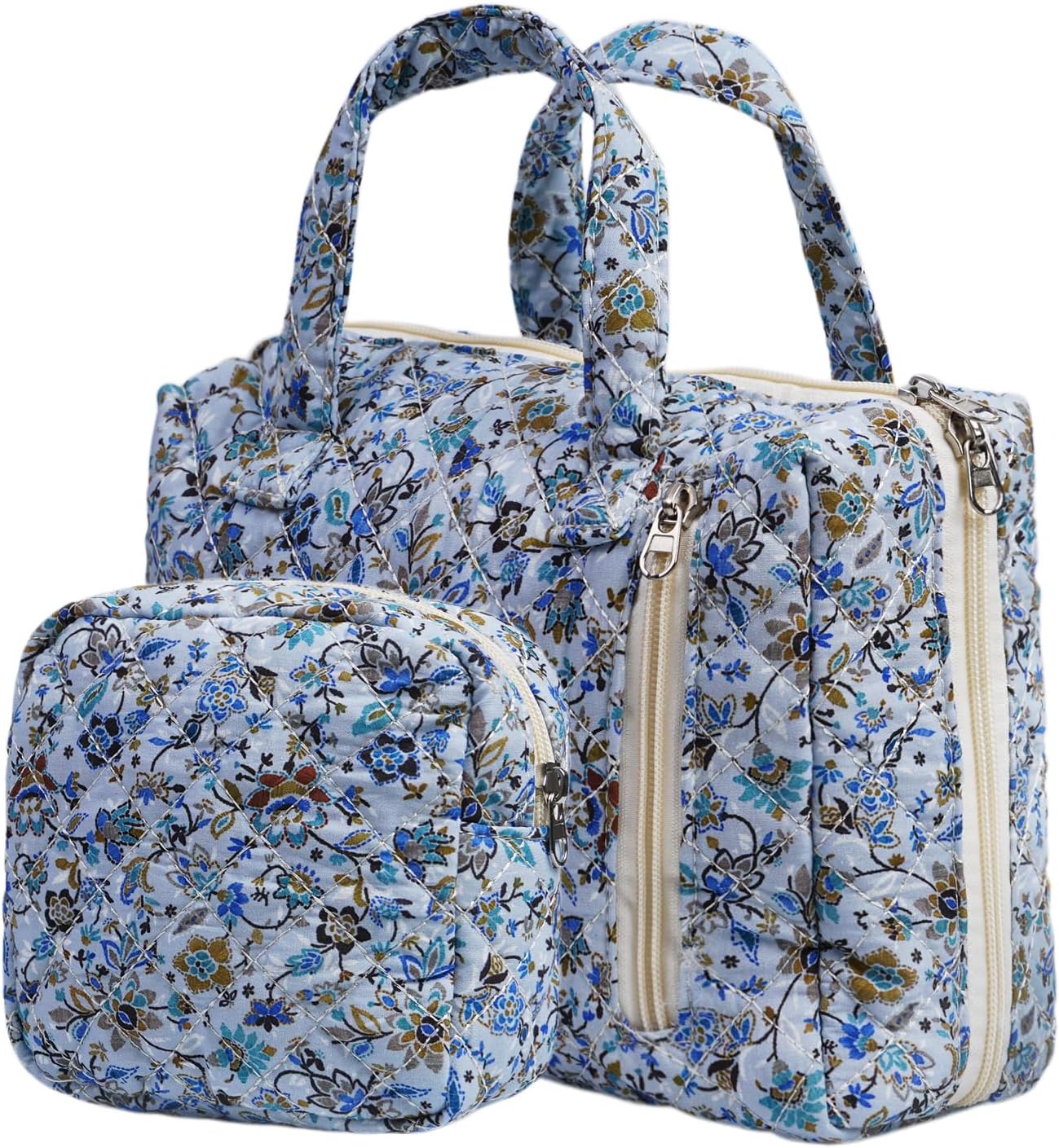 Cute Quilted Floral Makeup Bag(2Pcs),Coquette Aesthetic Cosmetic Bag,Travel Toiletry Bags, Kawaii Aesthetic pouch for Women (14-BlueVine)