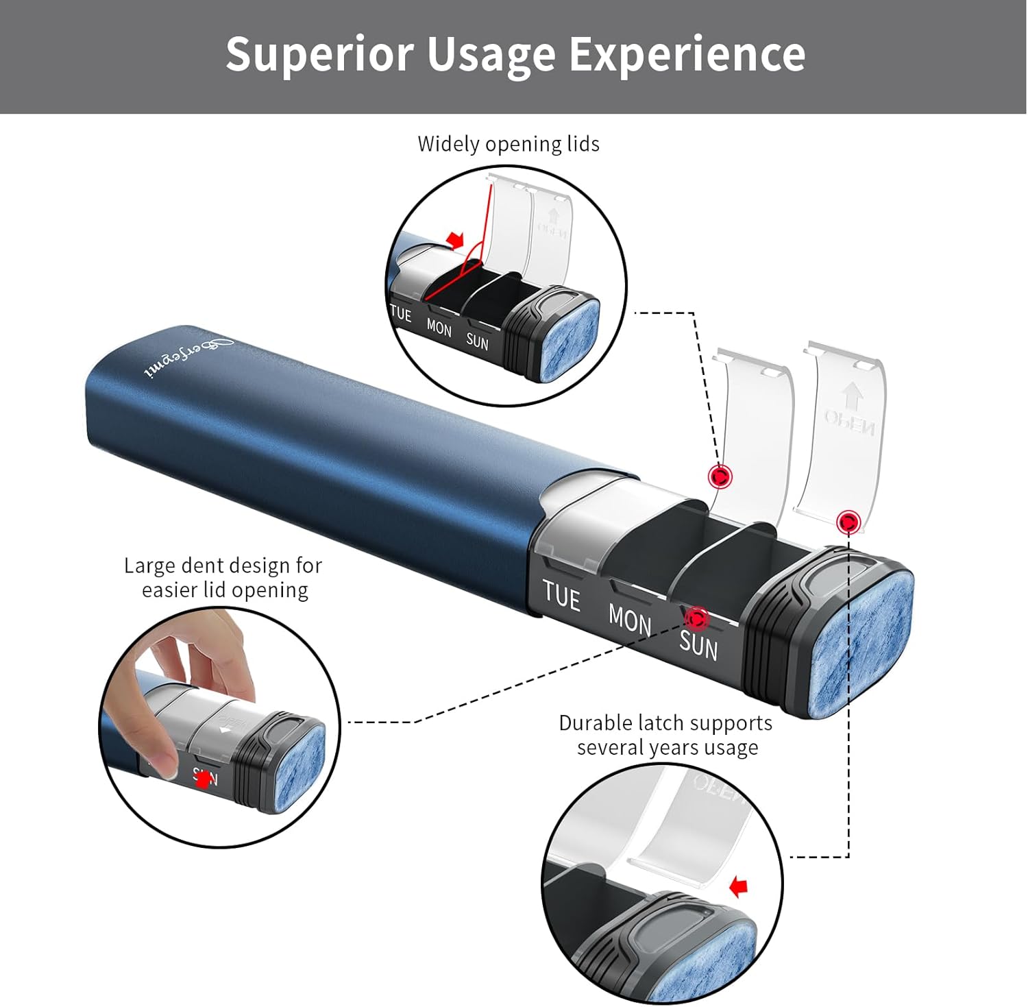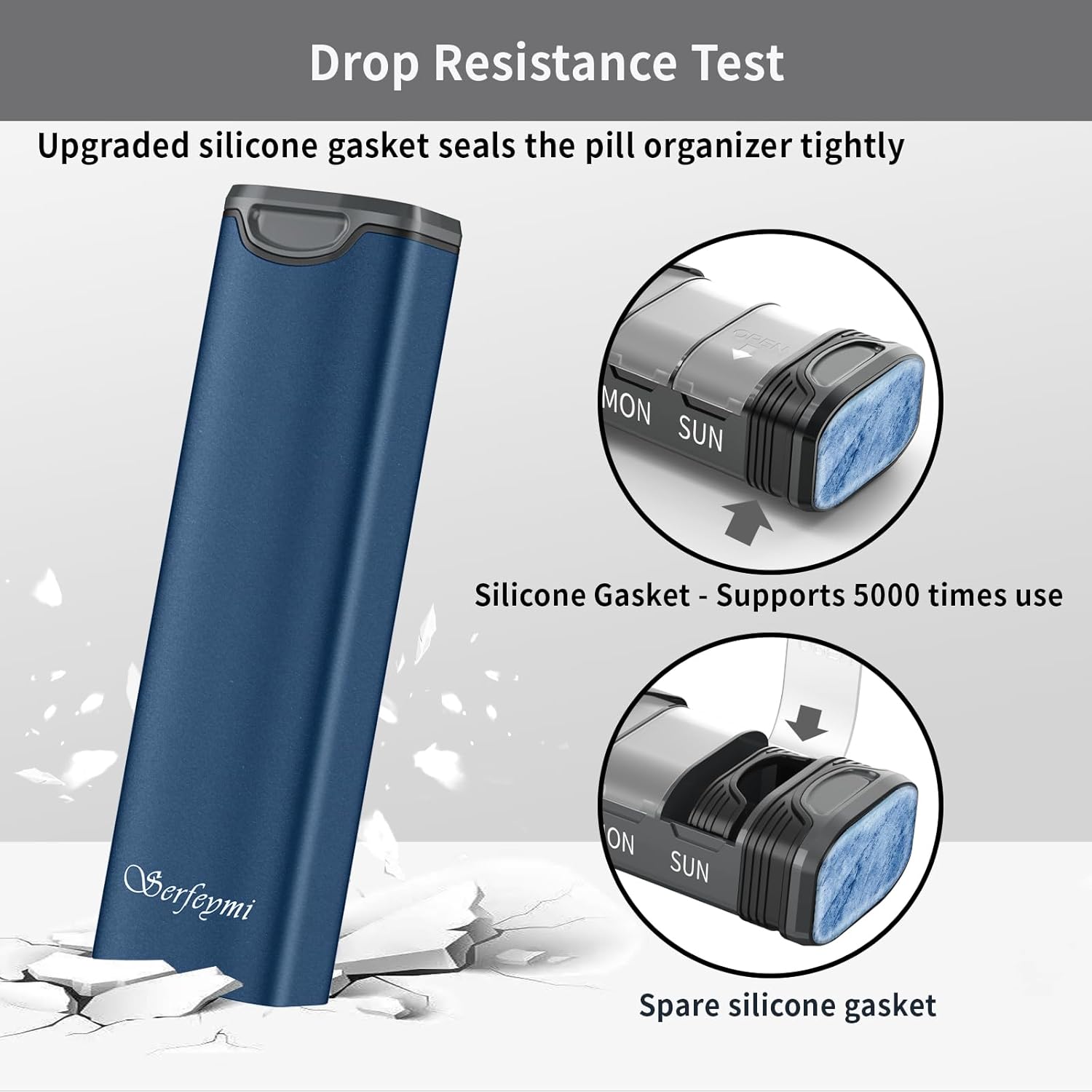 Metal Weekly Pill Organizer, Serfeymi Aluminum Daily Pill Box(Spare Gasket Provided),7 Day Pill Case Travel Medicine Organizer,Pill Containers with Individual Lid for Vitamins,Pills, Supplement-Blue