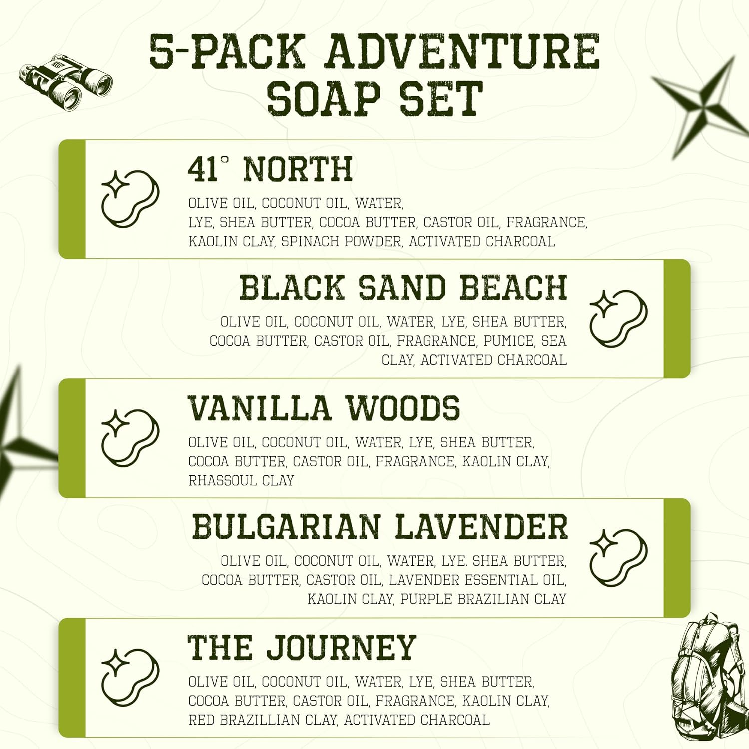- SCENT VARIETY: Elevate your grooming with a mix of bold scents in our variety pack, featuring 41° North, Black Sand Beach, Vanilla Woods, Bulgarian Lavender & The Journey. This women and mens body soap bar set is a perfect addition to your daily routine.