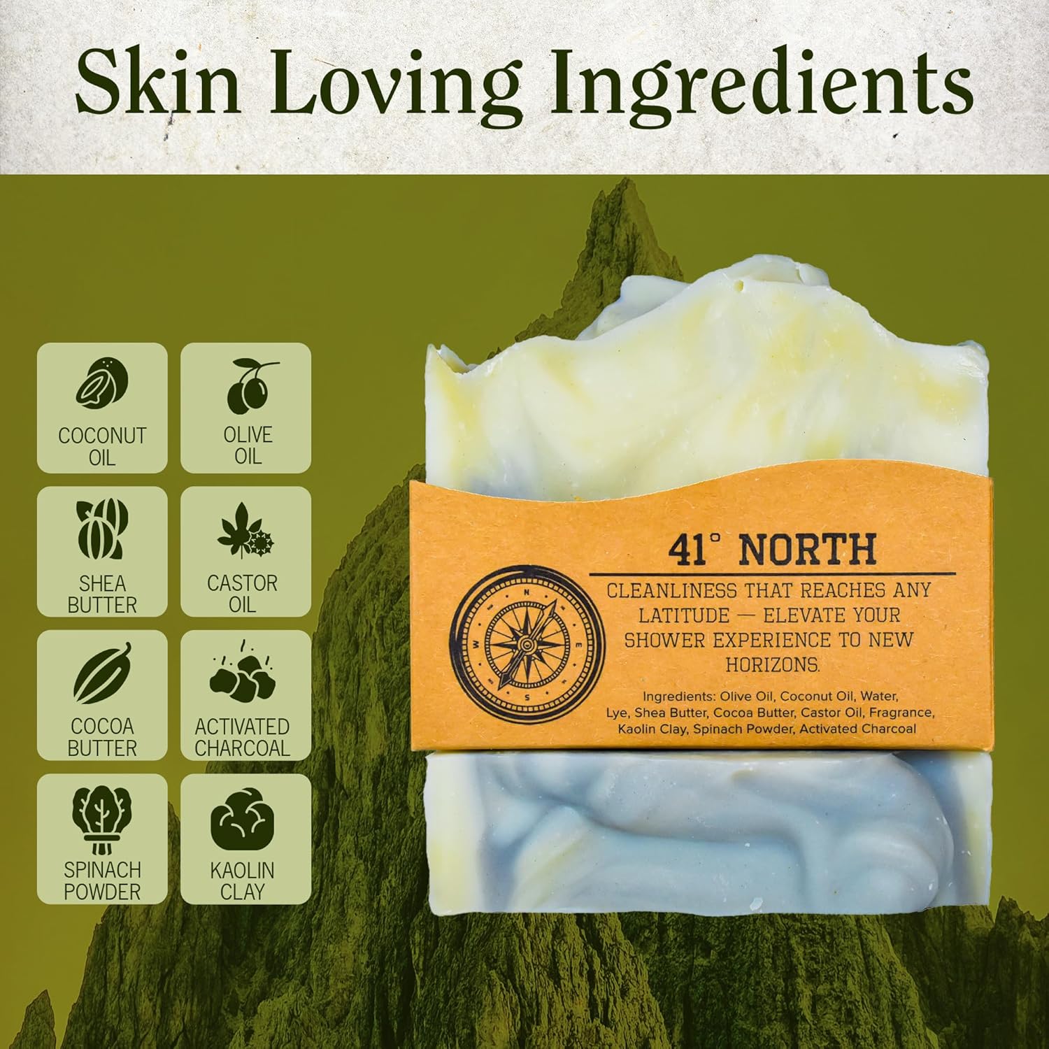 - PURE & SIMPLE FORMULA: Made with minimal ingredients, 41 North mens soap bar offers a straightforward clean. Infused with Bergamot, Juniper Berry, Patchouli, it provides a refreshing scent without unnecessary additives.