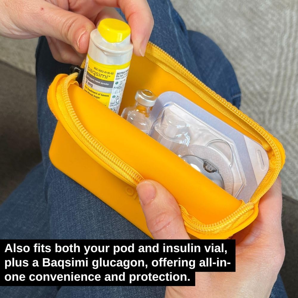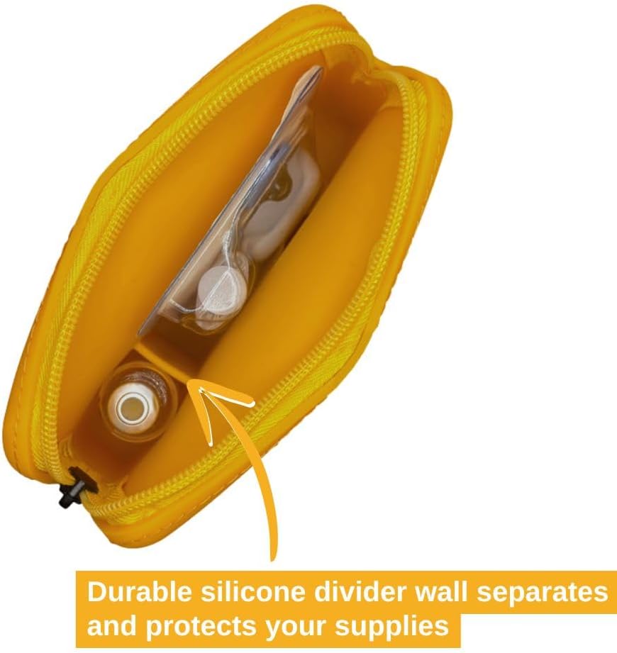 - 𝗛𝘆𝗴𝗶𝗲𝗻𝗶𝗰 𝗦𝘁𝗼𝗿𝗮𝗴𝗲: The non-porous surface of this silicone pouch ensures that your diabetes supplies always stay clean and secure. It’s easy to wipe down and sanitize, providing you with a hygienic storage solution for your insulin vial and Omnipod pod. Keeping your supplies free from dirt, dust, and moisture is essential to ensure the effectiveness and safety of your insulin. With this pouch, you can trust that your diabetes management tools are stored in a safe, sanitary, and easily maintainable case