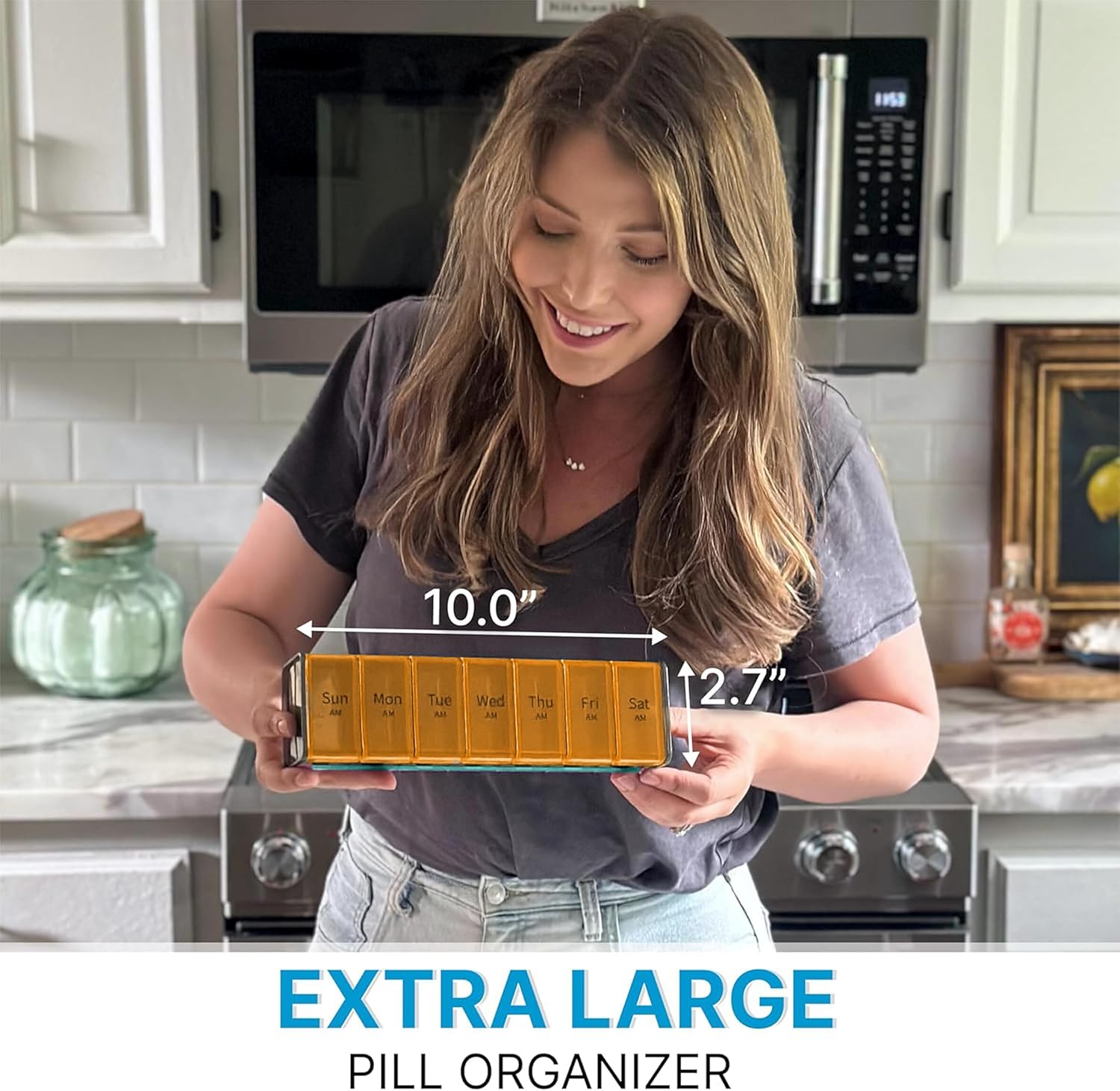 - 50% More Capacity – This extra large pill organizer holds much more tablets than standard pill boxes and organizer 2 times a day. Its oversized compartments easily store large supplements like fish oil, turmeric, or gummy vitamins