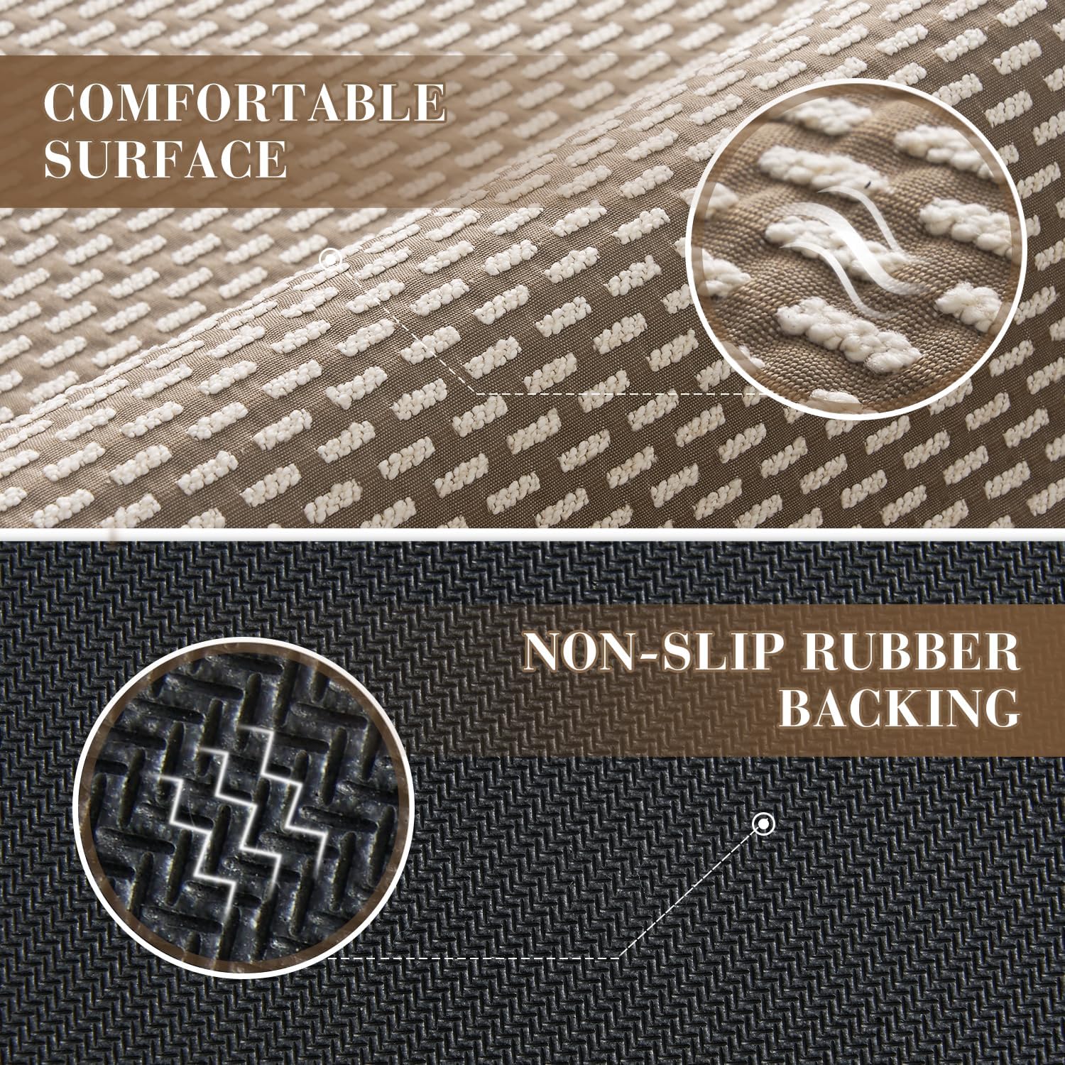 - No-pile Surface: The no-pile surface prevents hair and dirt from getting embedded, making it an ideal non-shedding bathroom rug for households with high foot traffic. The jaquard dots design not only adds aesthetic but also ensures long-lasting durability in use.