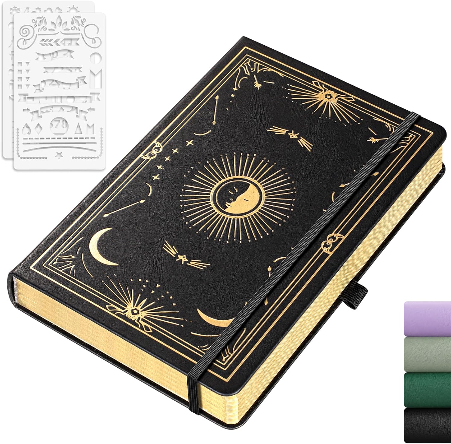 - Hardcover Design: The durable leather notebook with waterproof leather protects pages from wear. The A5 dotted journal cover is embossed with the sun and moon, adding sophistication and elegance. Measuring 5.75 in x 8.38 in, it effortlessly slips into backpacks.