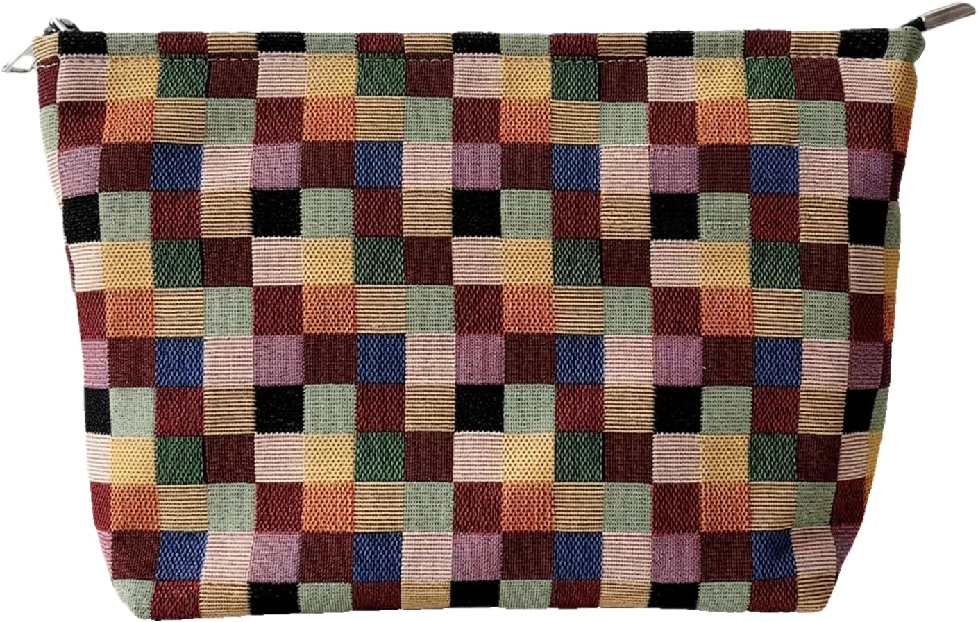 Stylish Checkered Canvas Makeup Bag – Travel Cosmetic Organizer (10.6 x 7.1 x 2.8 Inches), Large Cosmetic Bag, Colored Squares Zipper Pouch, Plaid Fabric, Plain lining