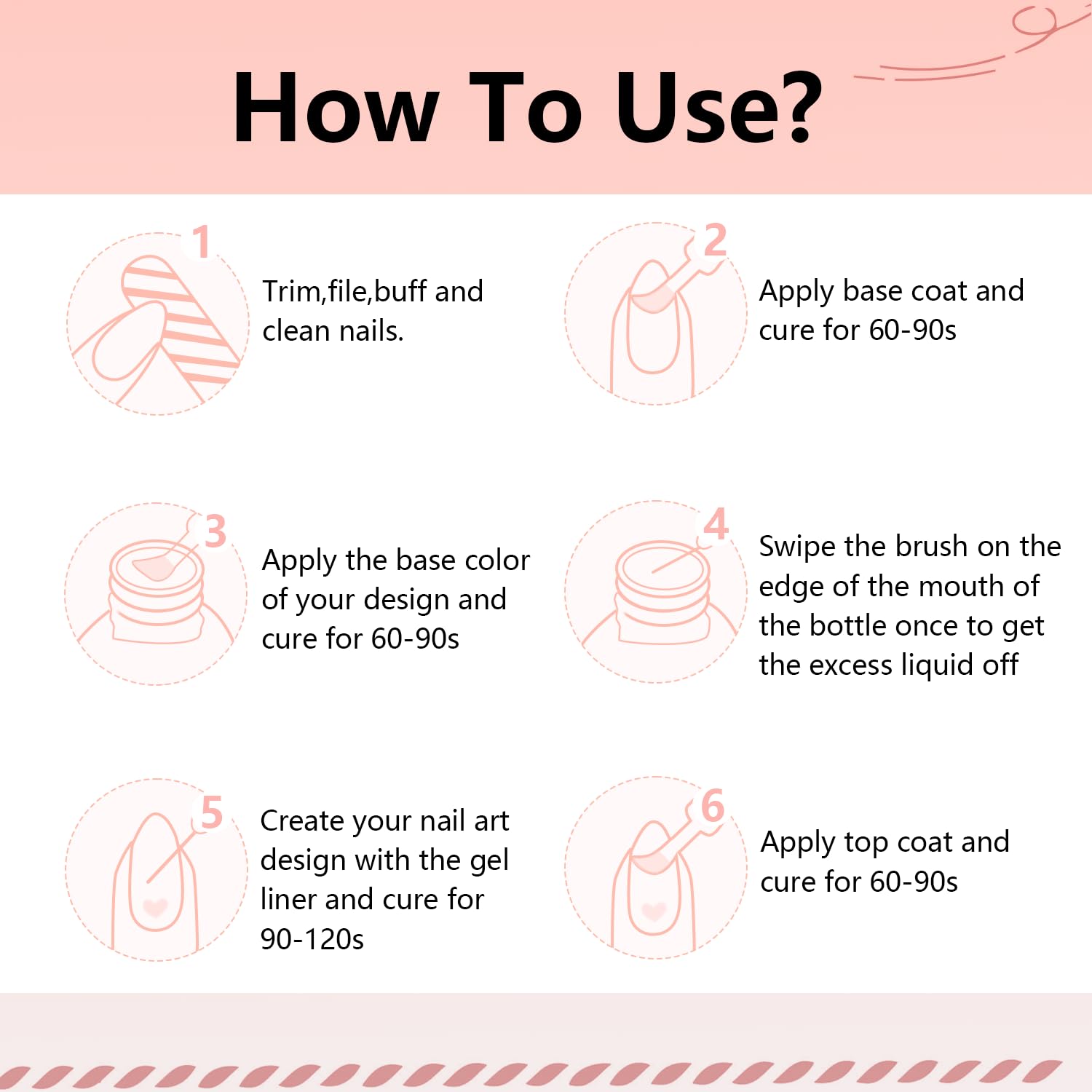 - You’ll Received:10Pcs Nail Art Gel Liner Paint Set.With the built-in thin brush, you don't have to get out your set of brushes for adding details and lines. of nail manicure decoration, especially for nail art manicures. It not only creates a gorgeous momentum for your nails.