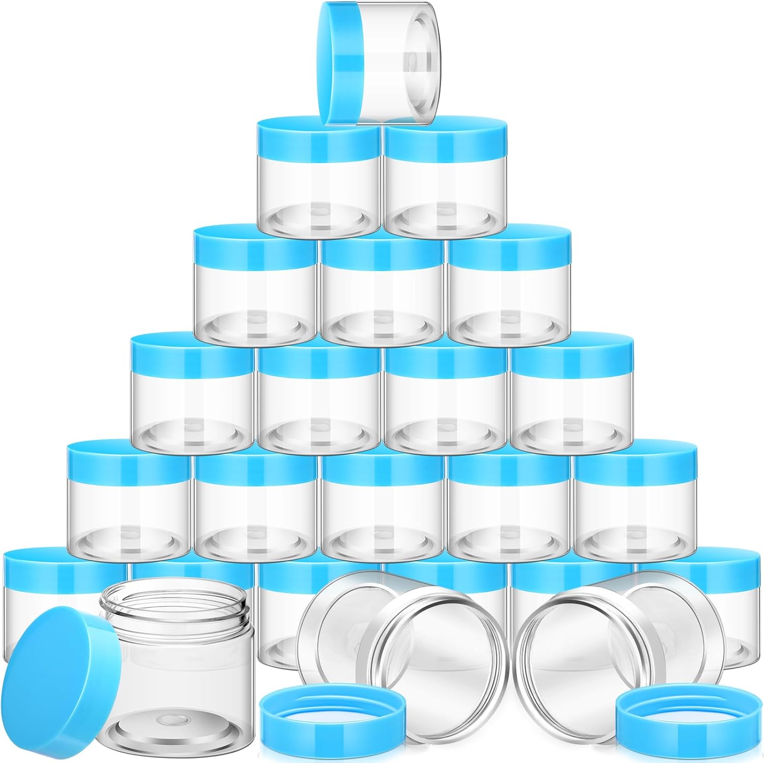 SATINIOR 24 Pieces Empty Clear Plastic Jars with Lids Round Storage Containers Wide Mouth for Beauty Product Cosmetic Cream Lotion Liquid Butter Craft and Food(Blue Lid,2 oz)