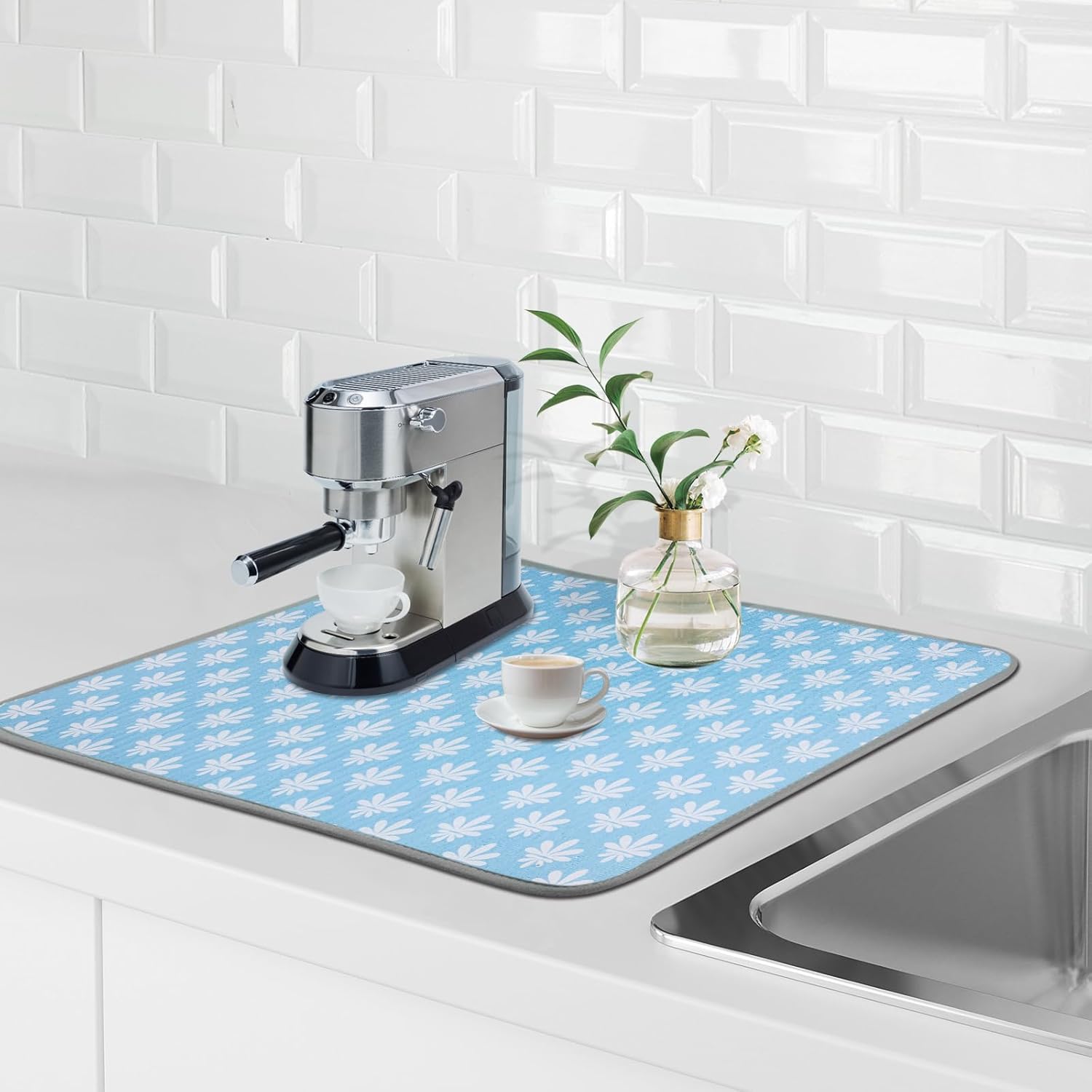 SHIYUE Dish Drying Mat for Kitchen Counter Super Absorbent Spring Kitchen Decor Microfiber Drying Matainers Rack Fast Pad Dish Drainer Mats(Light Blue Flower,18''x24'')