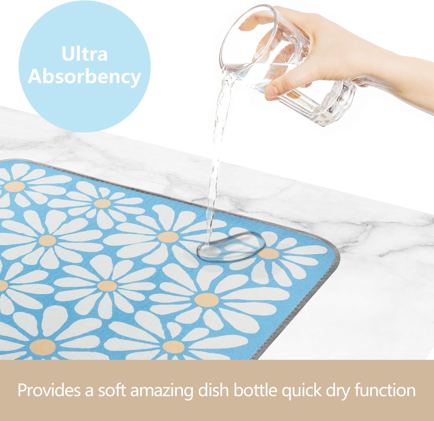 SHIYUE Dish Drying Mat for Kitchen Counter Super Absorbent Spring Kitchen Decor Microfiber Drying Matainers Rack Fast Pad Dish Drainer Mats(Sky Blue Flower,18''x24'')