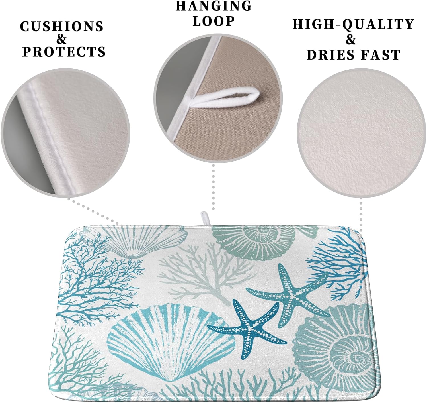 Summer Blue Dish Drying Mat for Kitchen Counter Nautical Coastal Teal Dishes Drainer Mats Beach Coral Seashell Starfish Ocean Absorbent Microfiber Dish Draining Pad 16x18 Inch