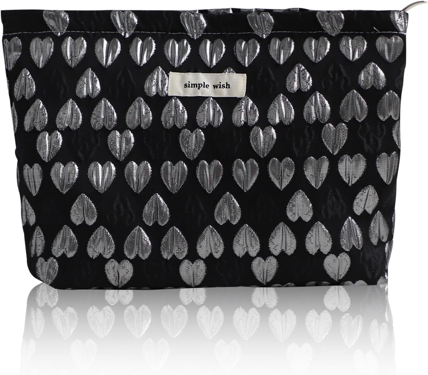 Wudygirl Cute Makeup Bag Cosmetic Bag Travel Cosmetic Pouch for Women Aesthetic Canvas Make up Organizer with Zipper Large Capacity Handbag Pencil Pouch (Black Heart)