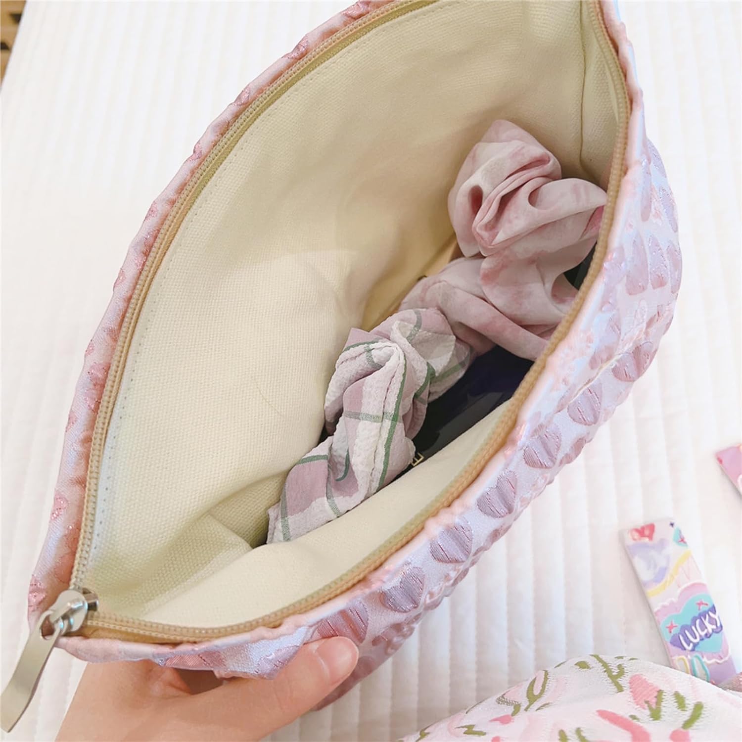 Wudygirl Makeup Bag Travel Cosmetic Bag Large Capacity Makeup Pouch for Women Canvas Make up Organizer Pencil Pouch Aesthetic Zipper Handbag (Pink Heart)