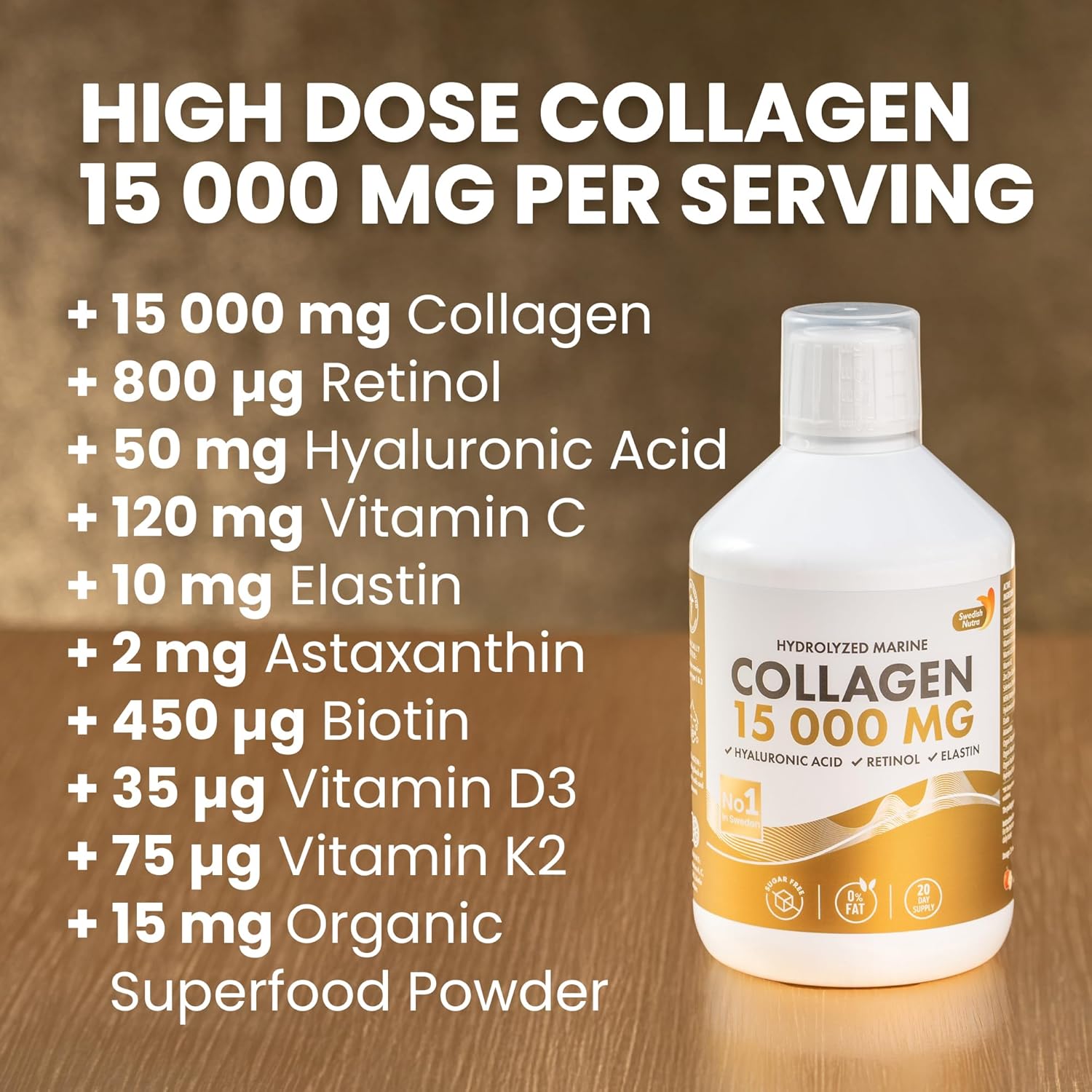 Swedish Nutra - Liquid Marine Collagen 15,000mg - 3 Packs of 500ml I Hydrolyzed Collagen Peptides (Type I & III) I Hyaluronic Acid, Biotin, Vitamin C I Sugar Free- 60 Day Supply