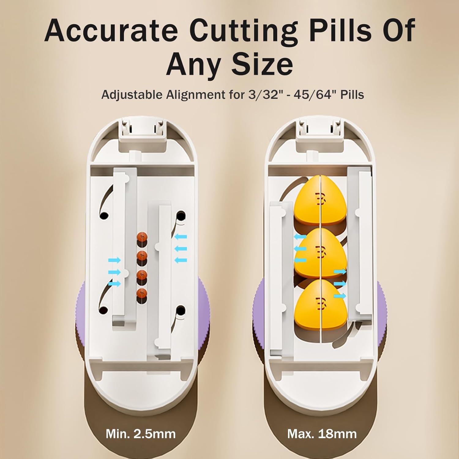 - Adjustable Alignment for 3/32" - 45/64" Pills: Slide-to-fit tray locks round/oval/standard pills (2.5mm - 18mm) in place for centered, precise cuts multiple pills every time