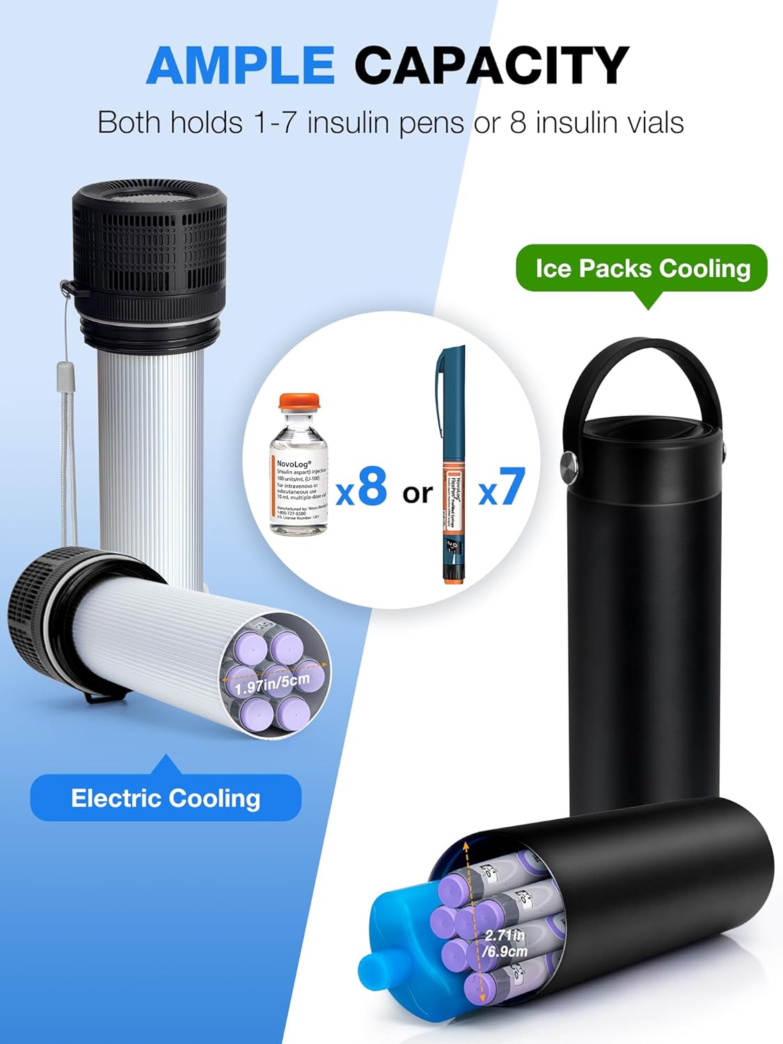- 📦 Larger Capacity & Smaller Size - Unlike other insulin organizer, the YOUSHARES diabetic travel case has more space to hold up to 8 insulin vials or 1-7 insulin pens or other medications. It measures only 2.9 x 2.9 x 10.2 in and can be easily held in one hand. Comes with a portable backpack and 90-degree charging cable for more convenient travel!