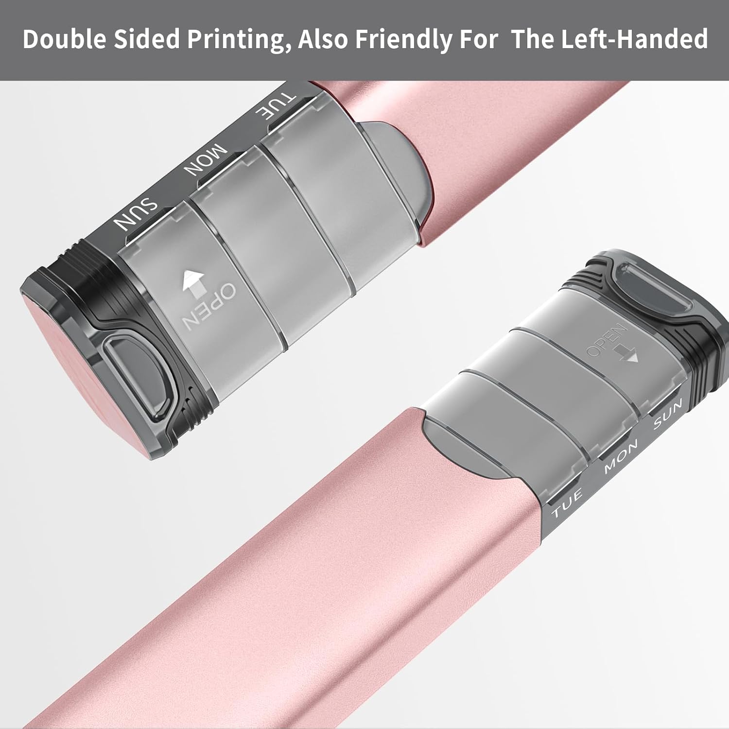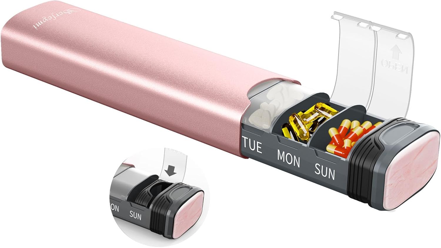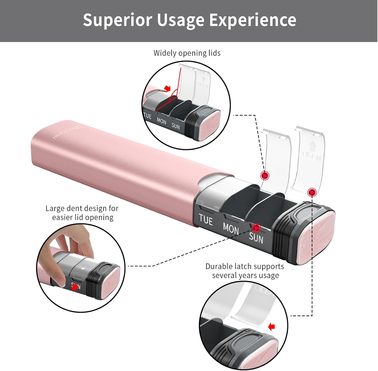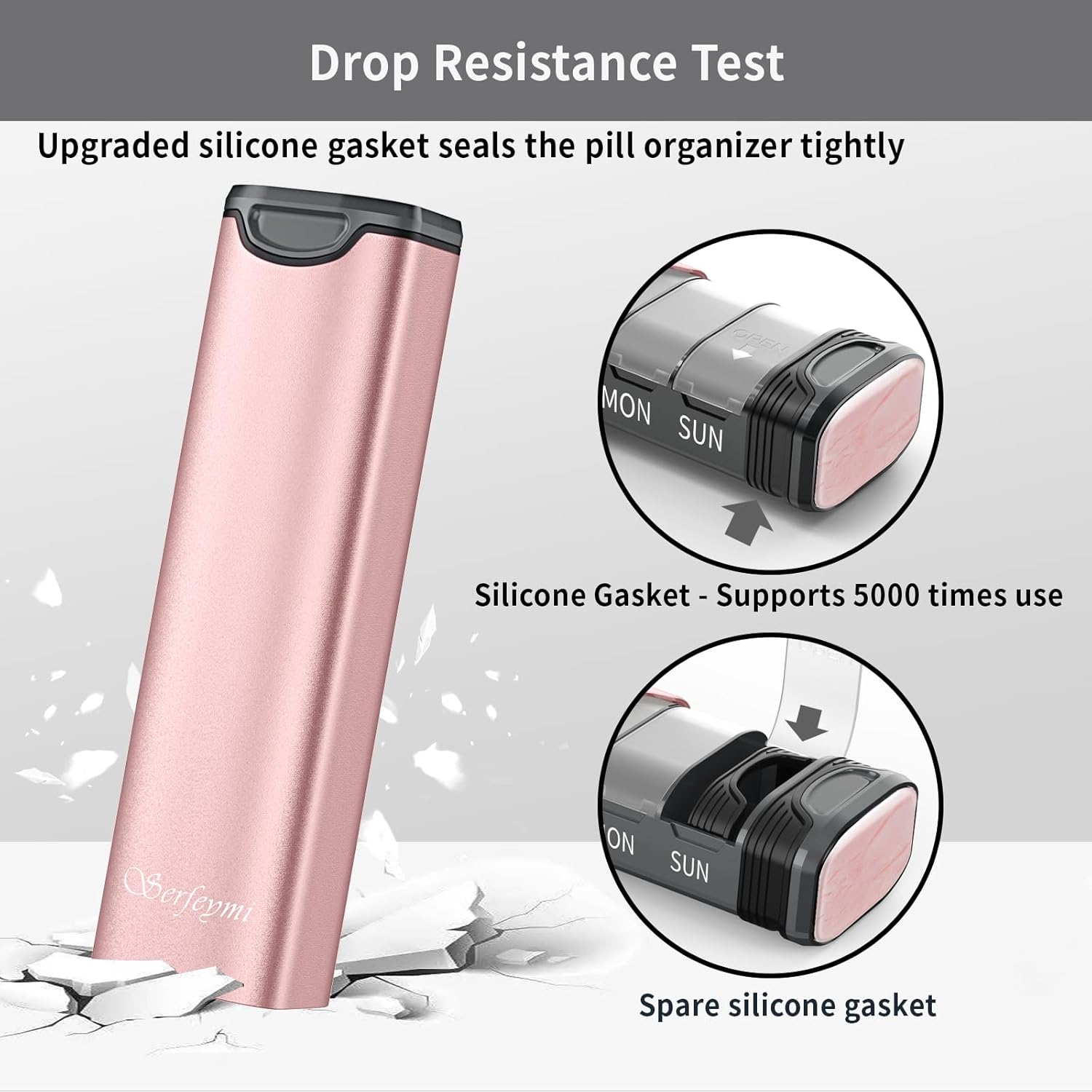 Metal Weekly Pill Organizer, Serfeymi Aluminum Daily Pill Box(Spare Gasket Provided),7 Day Pill Case Travel Medicine Organizer,Pill Containers with Individual Lid for Vitamins,Pills, Supplement-Pink