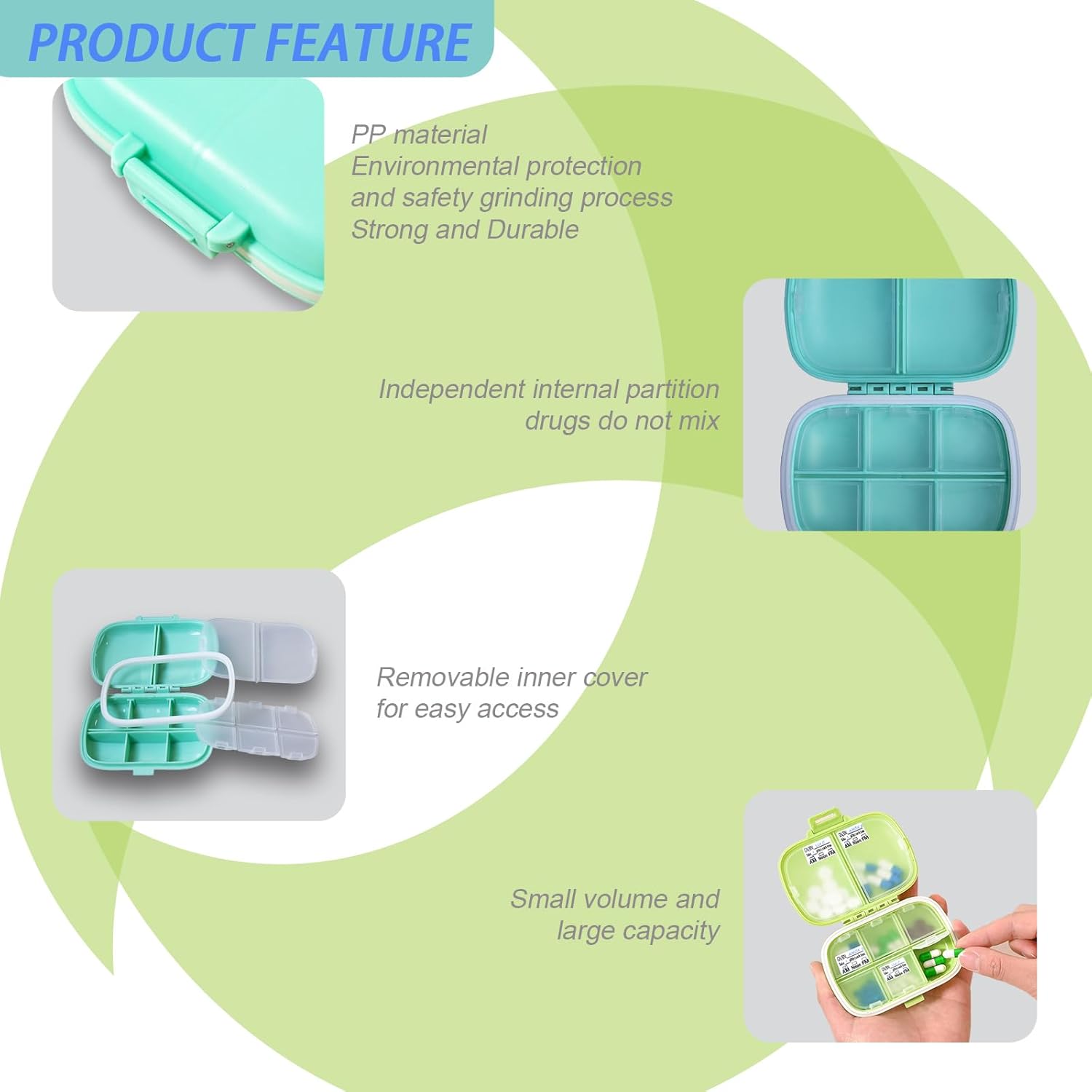 2-Pack 8-Compartment Travel Pill Organizer & Daily Pill Box | Leak-Proof Portable Medicine Container with 81 Replaceable Labels | Compact for Home, Office, Travel (Blue & Green)