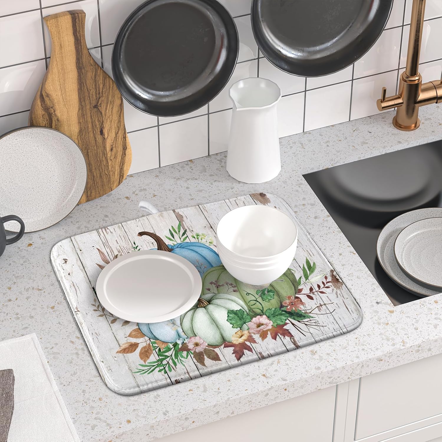 Fall Blue Pumpkin Dish Drying Mat 16x18 inch Autumn Harvest Dish Rack Mats Reversible Microfiber Drainer Pad for Kitchen Countertop Decor
