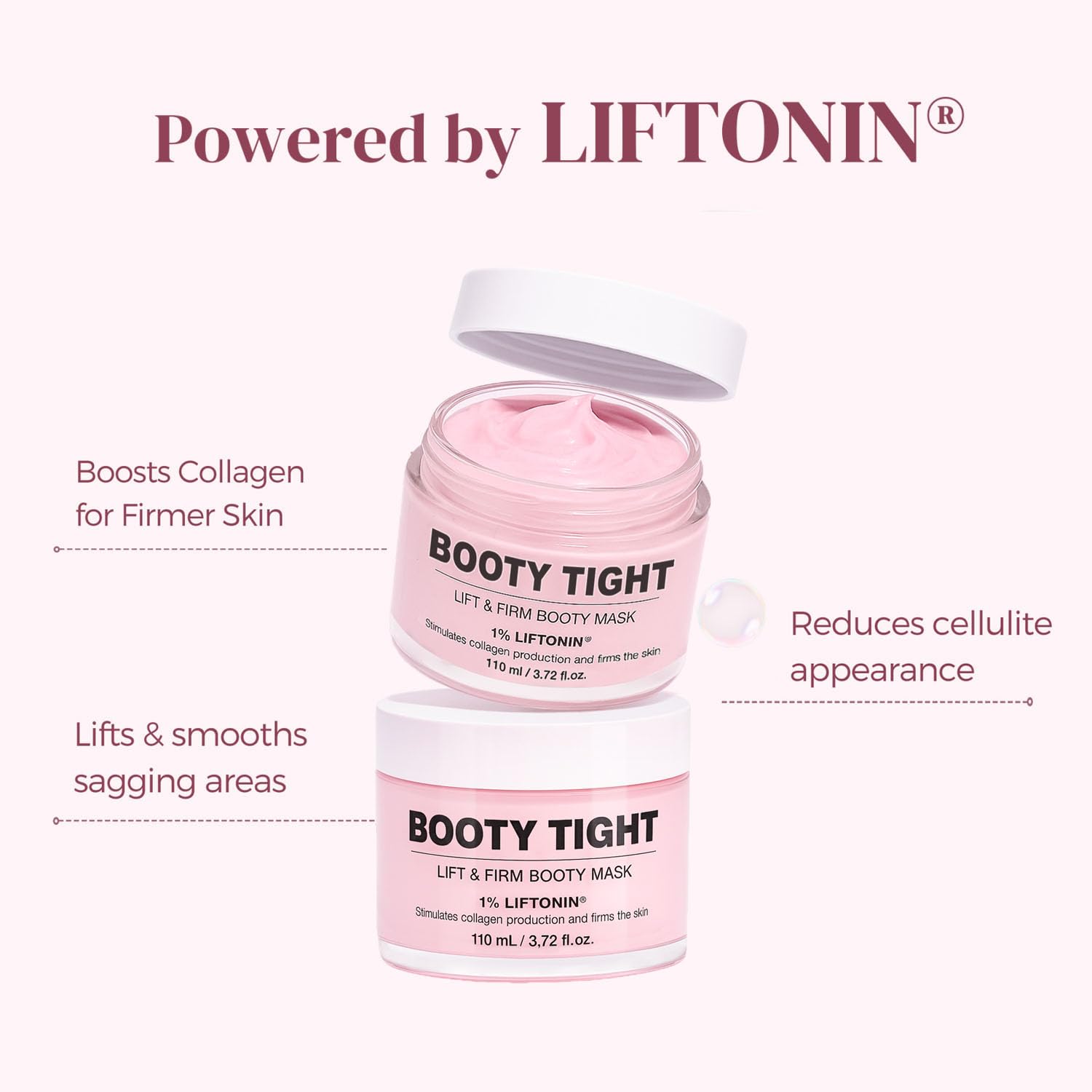 - Intensive Lift & Smooth Firming: Proven to reduce cellulite and firm sagging skin on the booty, thighs, abdomen, and arms. Formulated with LIFTONIN and Collagen, this B Tight Lift and Firm Booty Cellulite Cream boosts collagen production, enhances elasticity, and sculpts a smooth silhouette. Experience visibly tighter, lifted skin with every application, bringing out a more contoured look