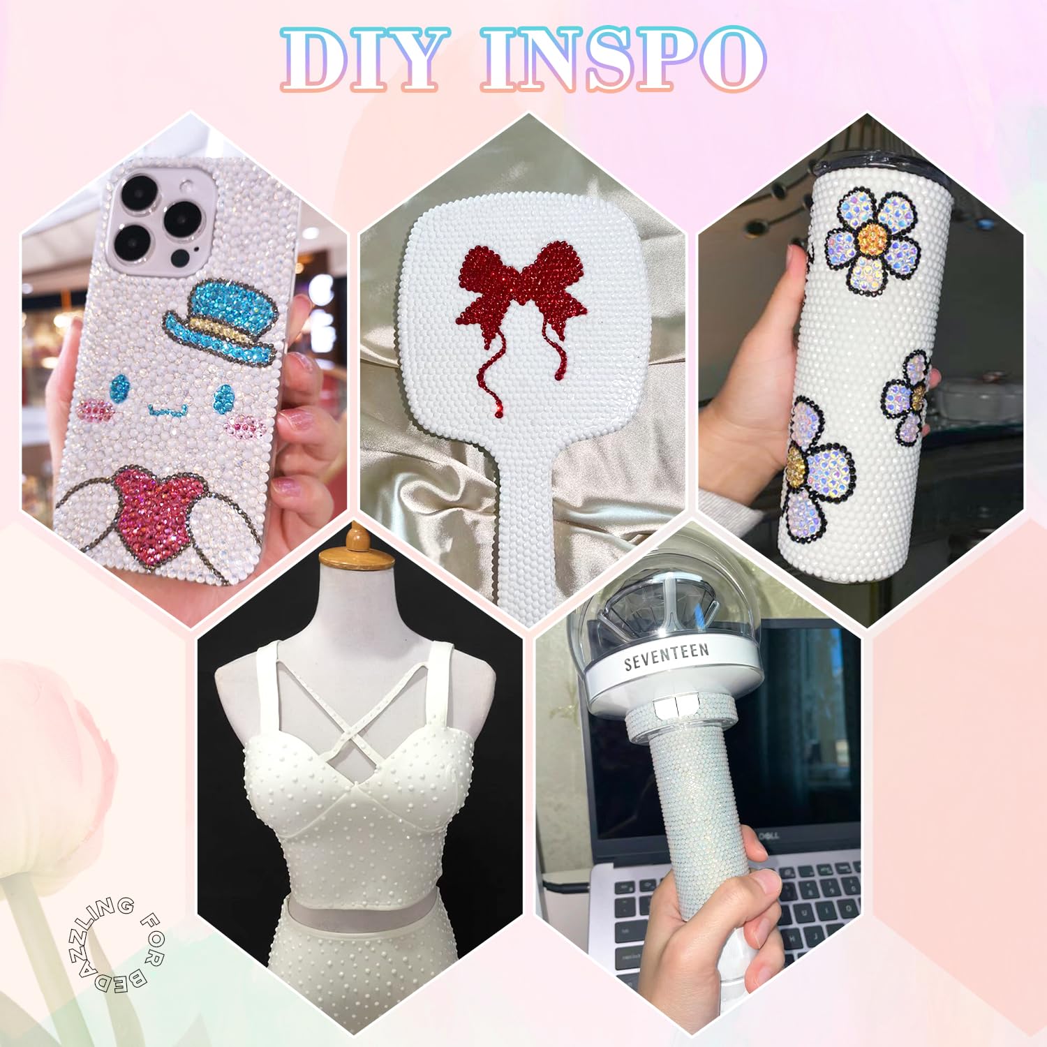 - PACKAGE CONTENT – This all-in-one bedazzler kit includes everything you need to start creating dazzling designs: 1 box of White rhinestones with 24 grids (approx. 30,000 pcs of bedazzling rhinestones assorted size SS6/10/16/20/30 ), 1 precision tweezers, 1 pickup pen for handling small gems, and 3 tubes of B7000 jewelry glue for secure application.