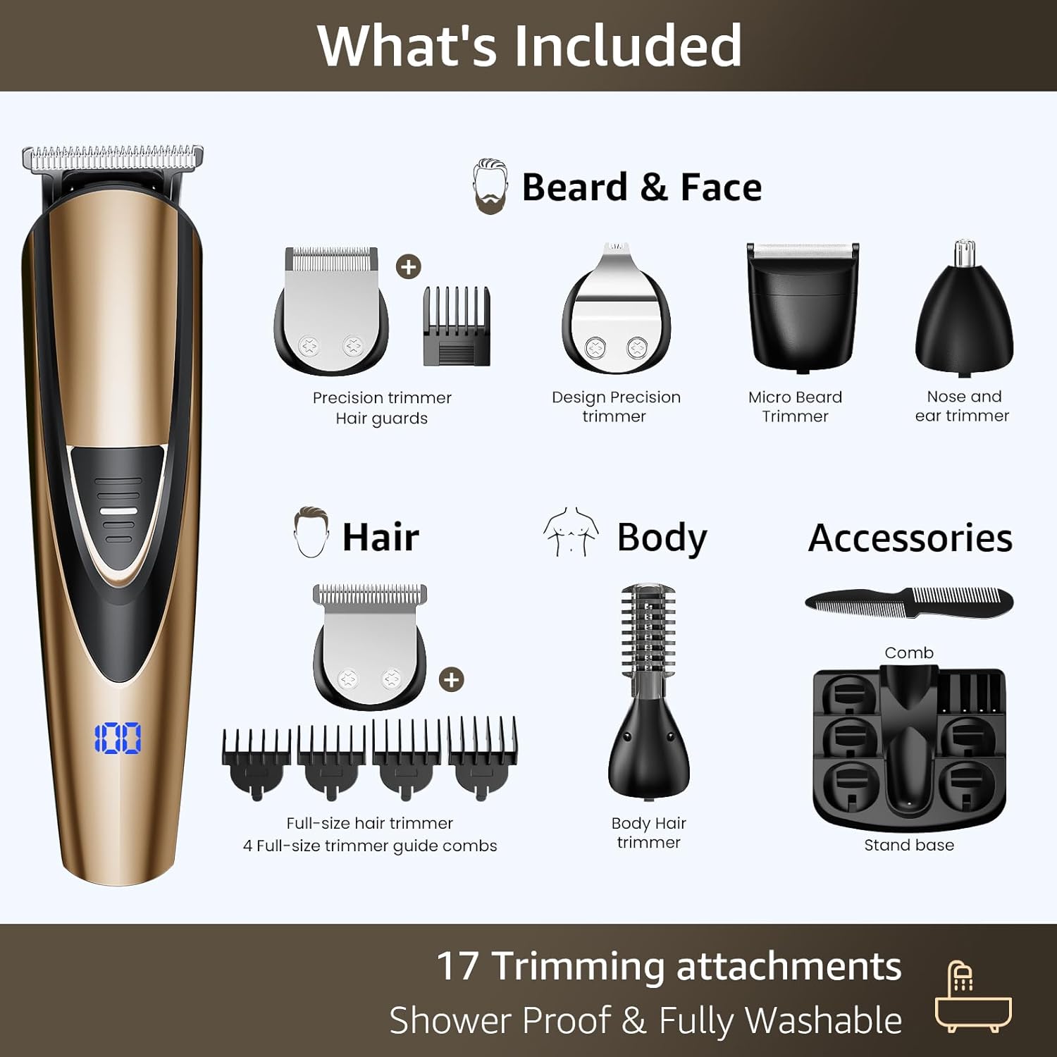 - Included Components : Guide Combs, Trimmer, Cleaning Brush, USB Cable
