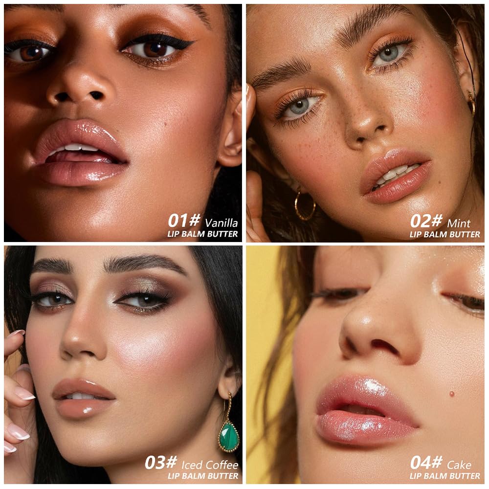 4PCS Summer Ultra-Hydrating Lip Butter Balm – Natural Vegan Lip Balm for Instant Moisture, Shine & Hydration, Sheer-Tinted, Soothes & Softens Dry Lips, Taste Vanilla & Mint & lced Coffee & Cake