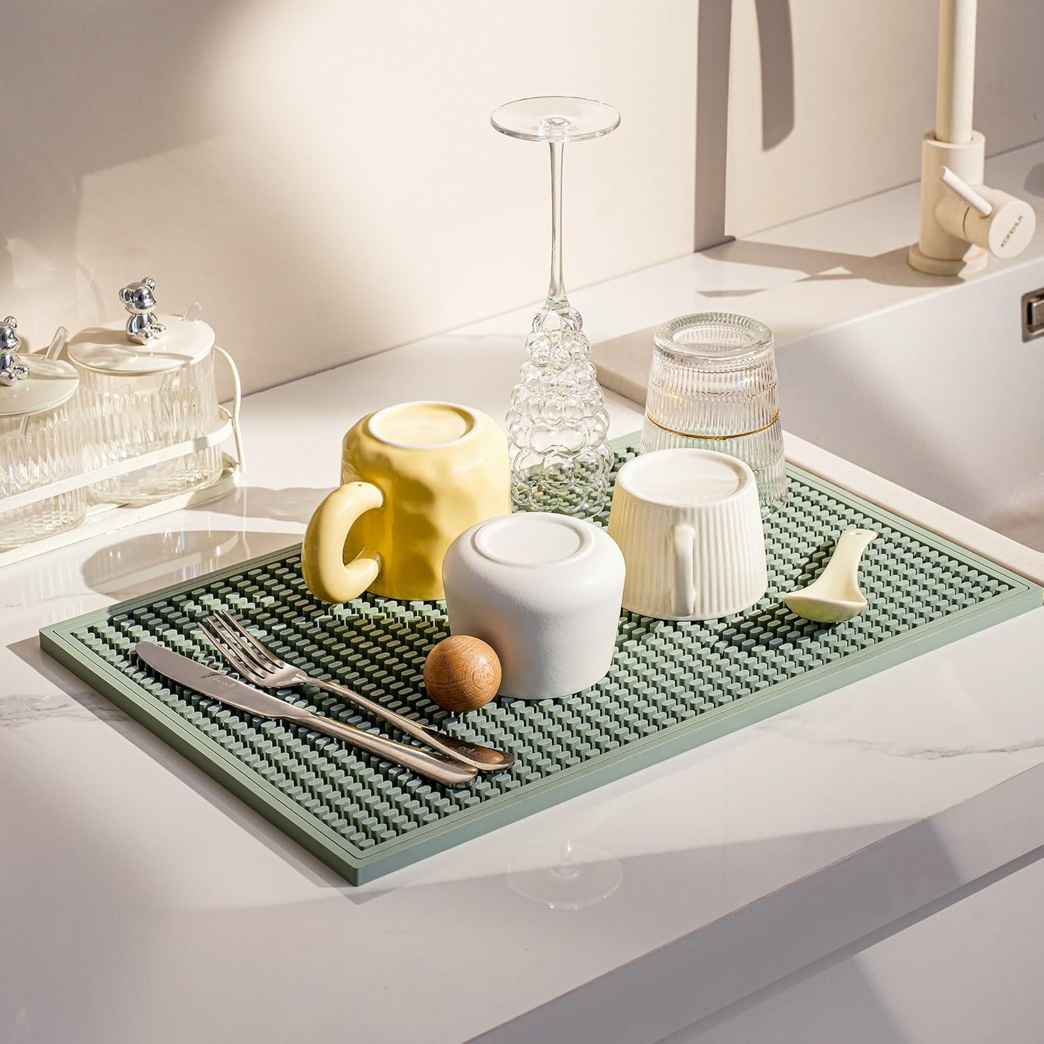 - Superior Drainage & Ventilation: Engineered with deep grooves and elevated ridges, this dish drying mats for kitchen counter promotes rapid airflow and prevents water pooling. Spills stay contained within the edges, keeping countertops dry and tidy. Say goodbye to soggy dish mat drying kitchen mat messes and hello to faster drying times!