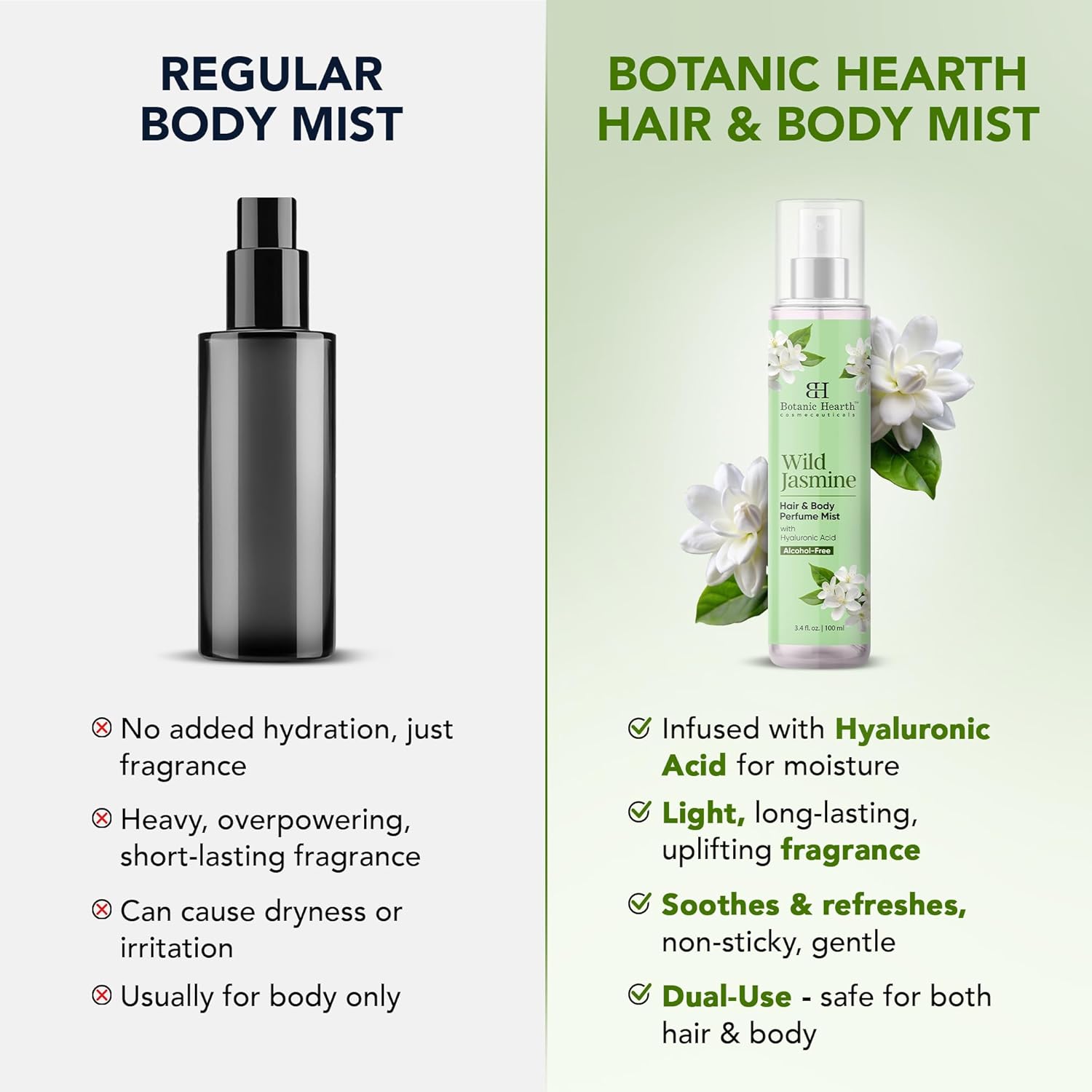 Botanic Hearth Wild Jasmine Hair & Body Perfume Mist with Hyaluronic Acid, Alcohol-Free, Long Lasting Hydrating Body & Hair Spray, 3.4 fl oz / 100 ml
