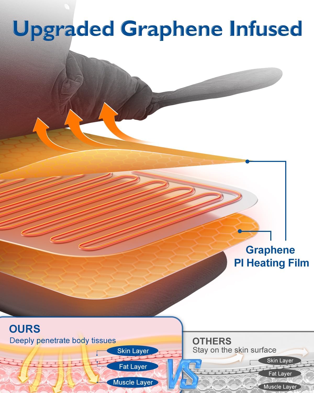 - The Power of Graphene – Deep Relief: We've infused cutting-edge graphene (nature's thermal superstar) into our electric heating pad. When heated, the heat spreads uniformly instantly, then dives deep beneath the skin layer – fat layer – muscle layer , targeting the root of stubborn muscle tension and joint stiffness. It's a deep-tissue embrace. Compared to standard heating pads, graphene delivers heat more evenly and effectively, promoting better blood flow and offering significantly deeper, longer-lasting pain relief. Unique retirement or birthday gifts for mom dad grandma grandpa