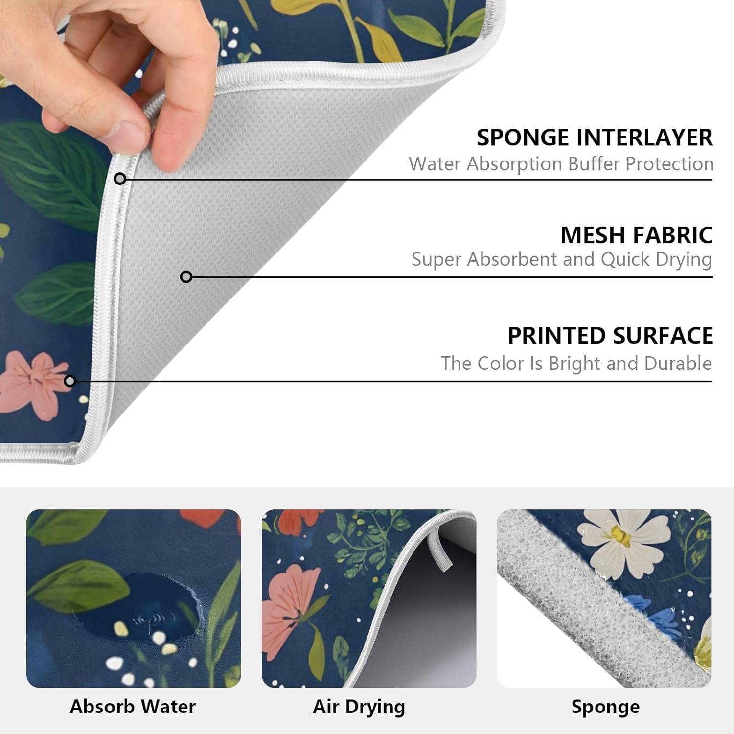 Wildflowers Dark Blue Dish Drying Mats for Kitchen Counter Absorbent Microfiber Dish Drying Matt 16 x 18 Inch Draining Reusable Rack Pad