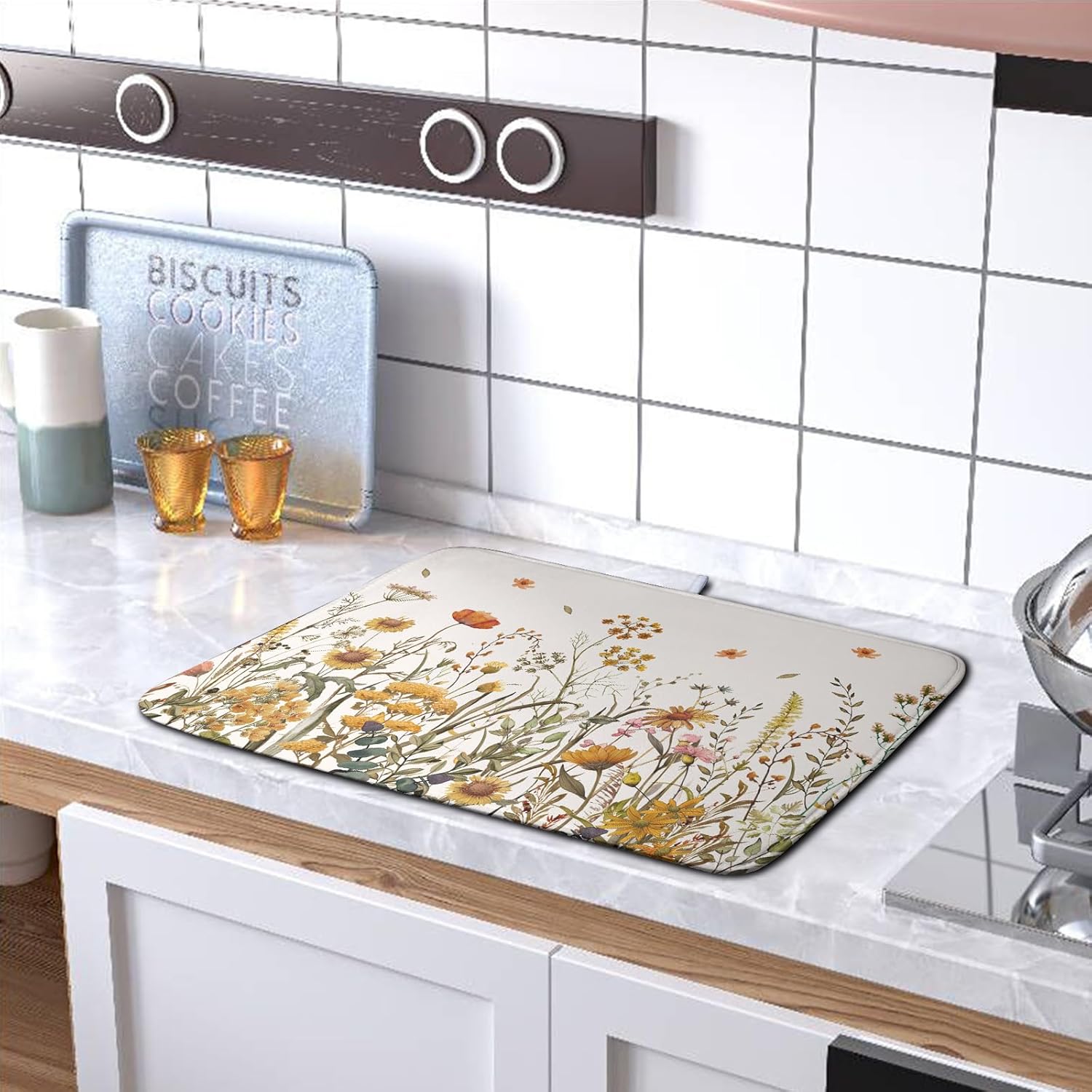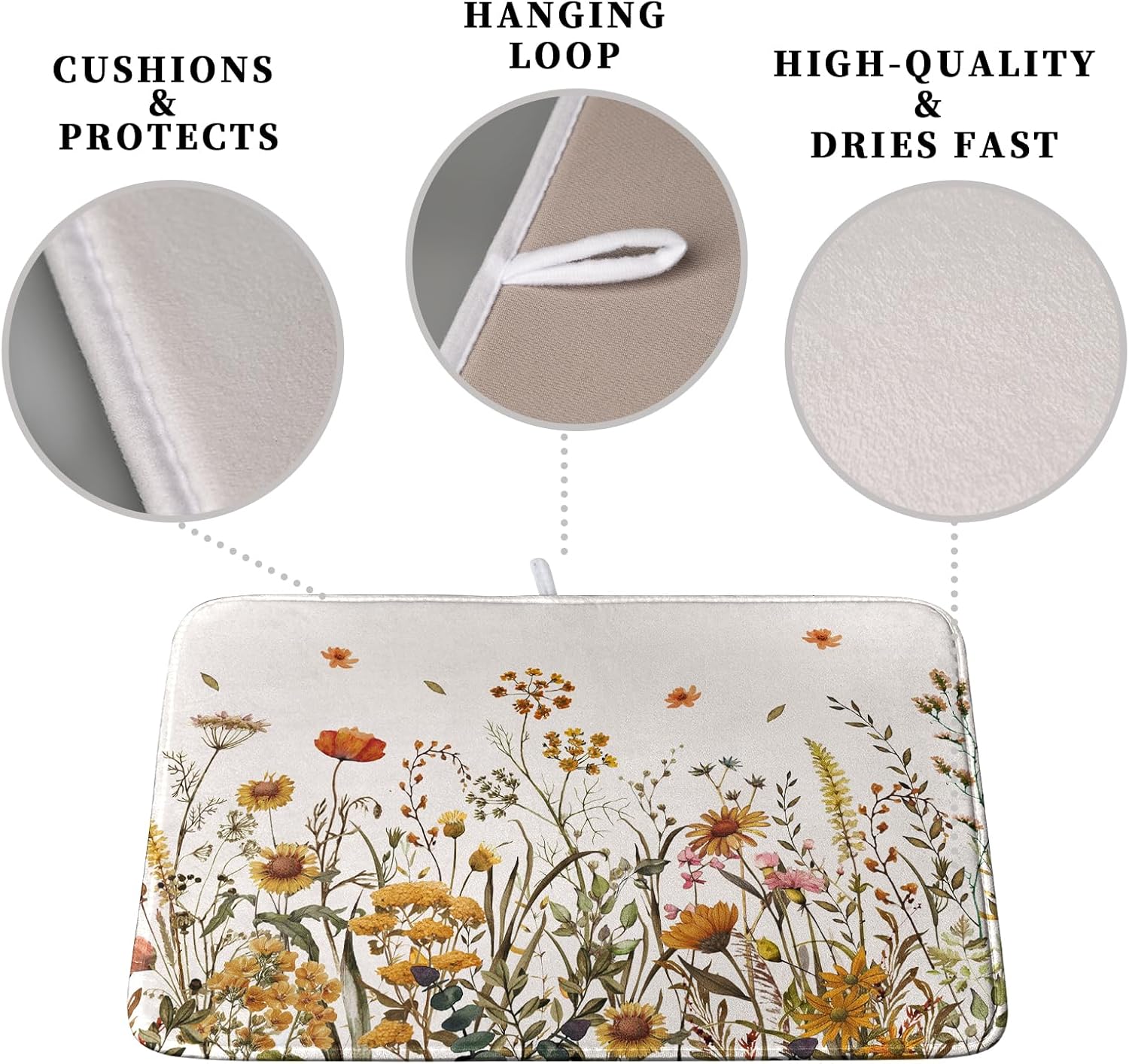Fall Floral Dish Drying Mat for Kitchen Counter Autumn Burnt Orange Wild Flowers Dish Draining Mat Absorbent Microfiber Dishes Pad Washable Dish Drainer Rack Mat Medium 16"x18"