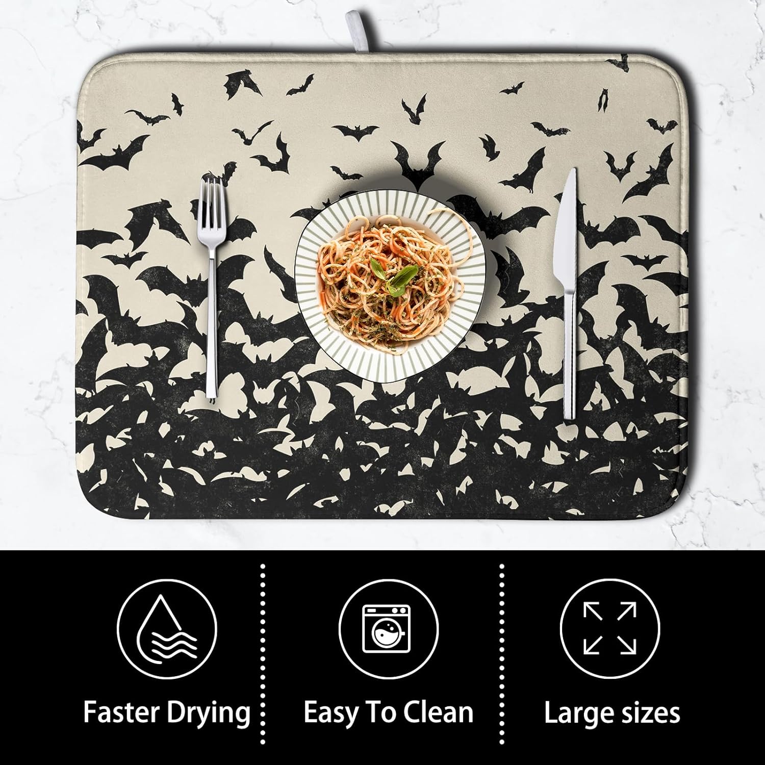 - Multifunctional Pad: Beautiful print on surface side, and reverses to a solid color. The halloween drying mat for kitchen counter absorbs water well, great for air drying dishes, glasses, bottles, silverware, fruits and vegetables, adds stability when drying fragile items