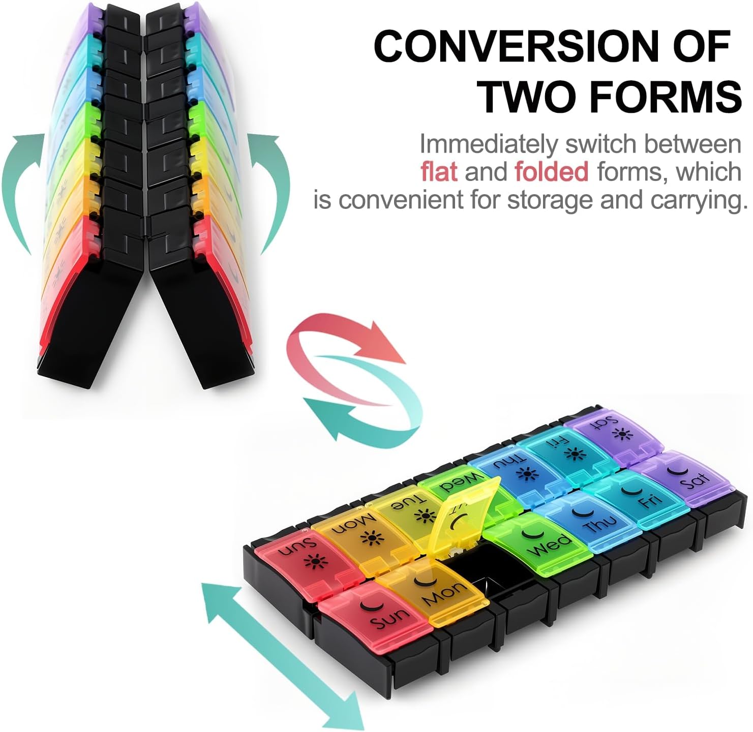 - LARGE COMPARTMENT FOR LARGE PILLS - Each Weekly Pill Box has 14 compartments, which are divided into AM PM parts, and can be tiled or folded. These compartments are designed according to larger pills, such as fish oil and multivitamin capsules. The size of the XL Large Medicine Box is enough to hold a variety of pills. You can store up to 300 pills and make a weekly pill plan.