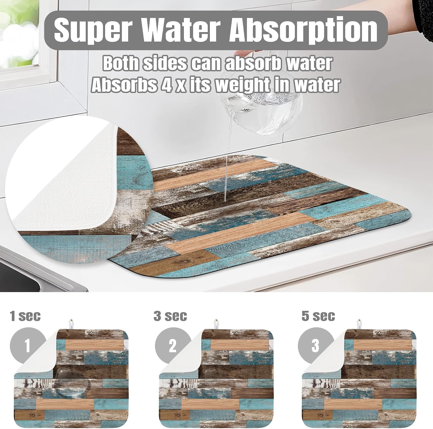 Dish Drying Mat for Kitchen Counter Large 16" x 18" Farmhouse Rustic Wood Absorbent Microfiber Dishes Drainer Rack Mats Pad Reusable Washable
