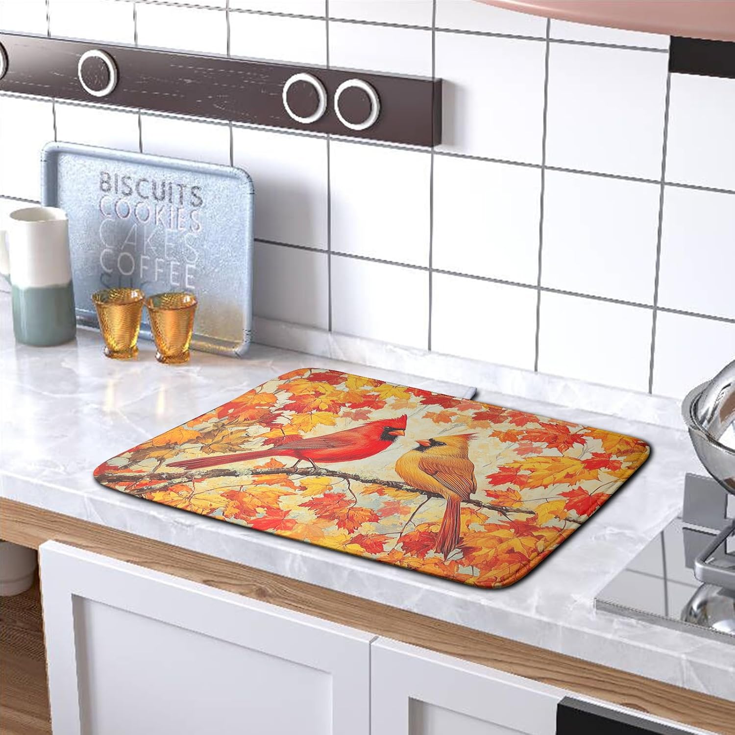 Fall Dish Drying Mats for Kitchen Counter Maple Leaf Cardinal Birds Dish Draining Mat 16x18 Inch Autumn Thanksgiving Dish Rack Mat Microfiber Absorbent Dish Drainer Pad
