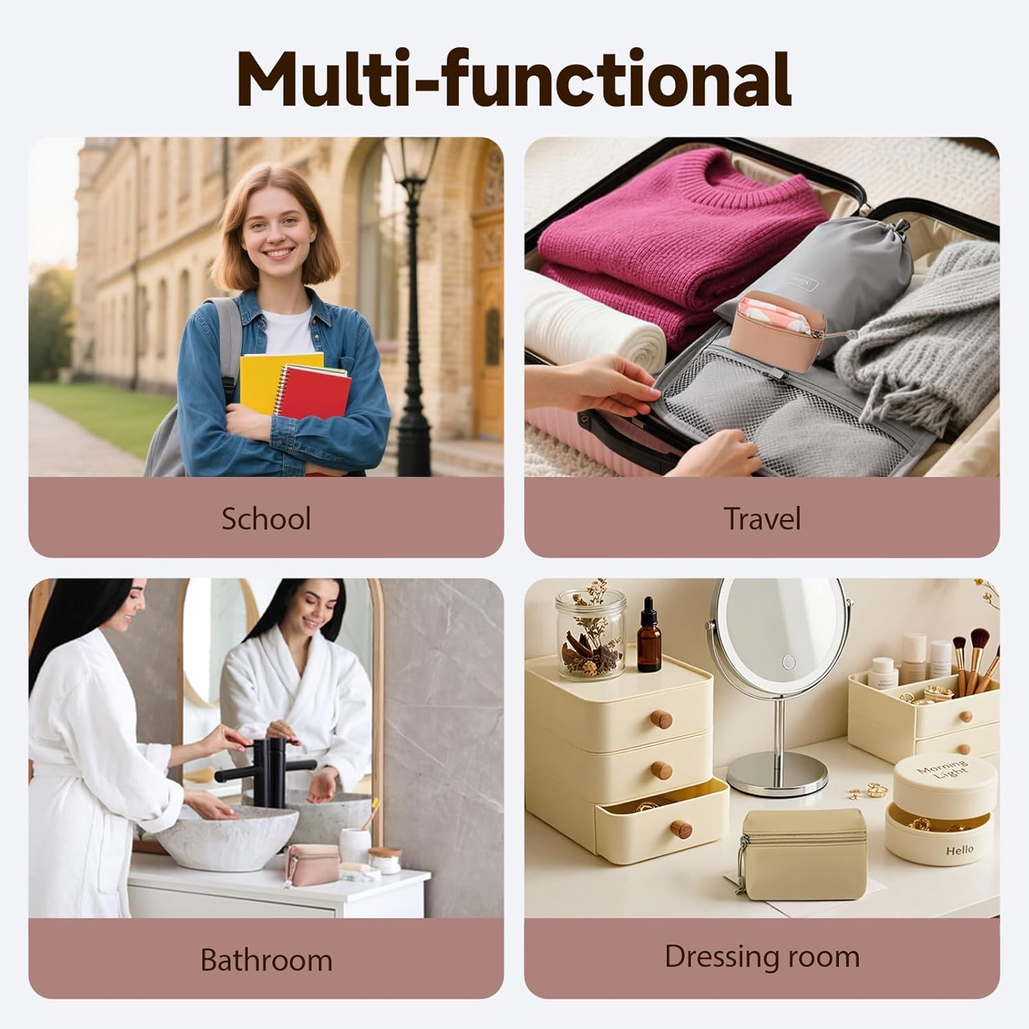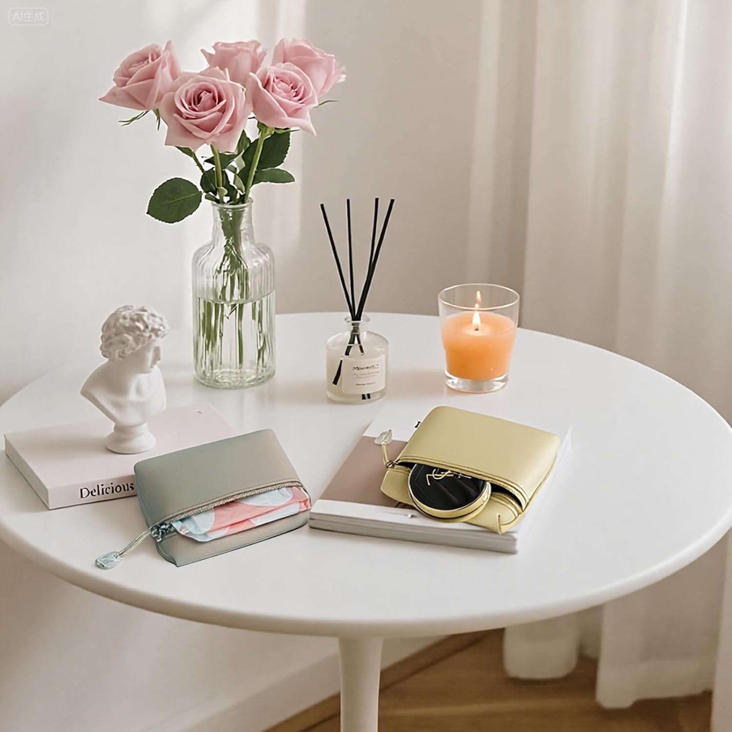 - /Multifunctional Scenes/:More than just a makeup pouch, it doubles capable of a travel organizer or coin/key pouch, and sanitary napkin storage bags,offering a cute and private way to store sanitary napkins, tampons, or liners.Used for any activities in daily life, such as on the go, shopping, work, travel, gym, everyday use etc.