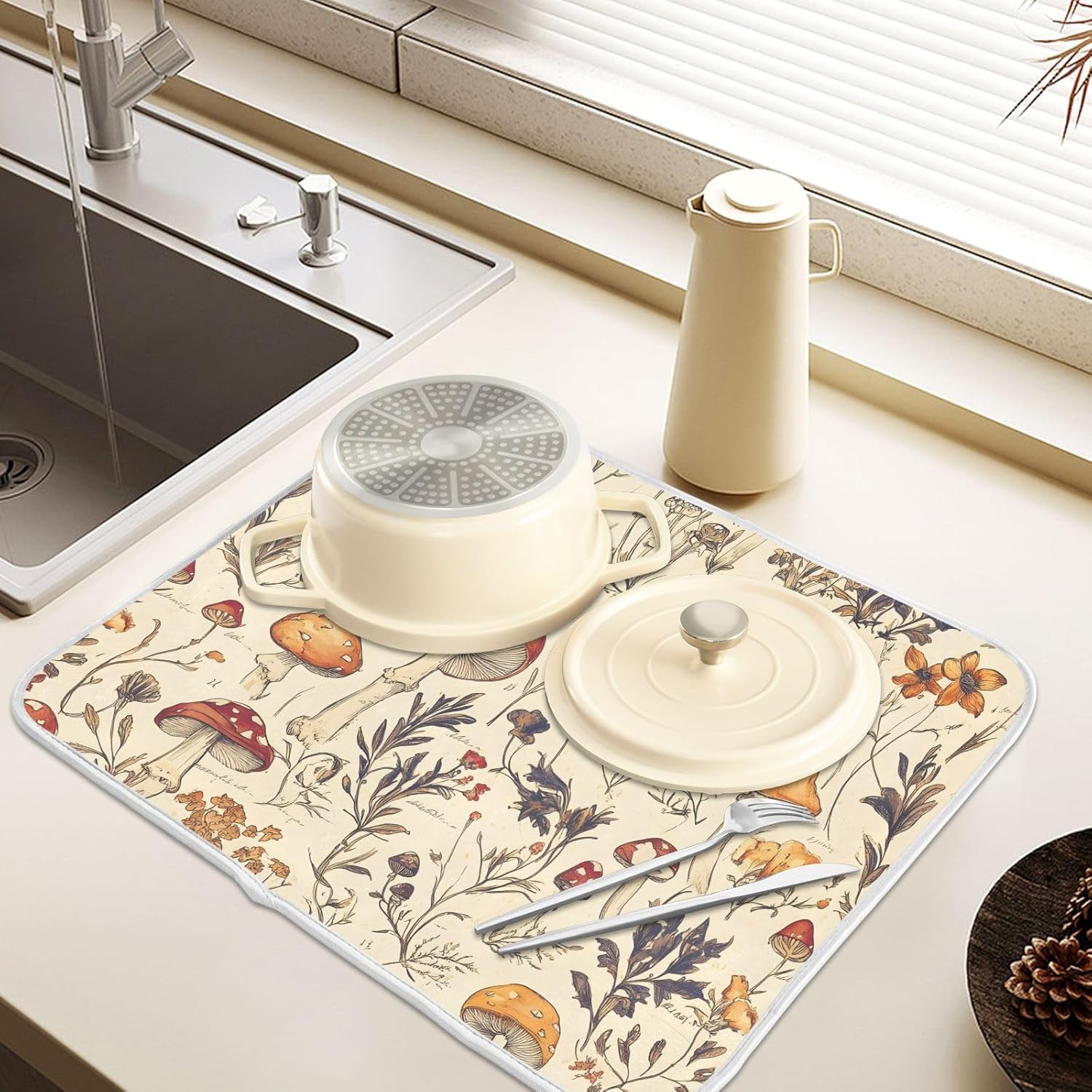 Mushroom Autumn Grass Dish Drying Mats for Kitchen Counter Absorbent Microfiber Dish Drying Matt 16 x 18 Inch Draining Reusable Rack Pad