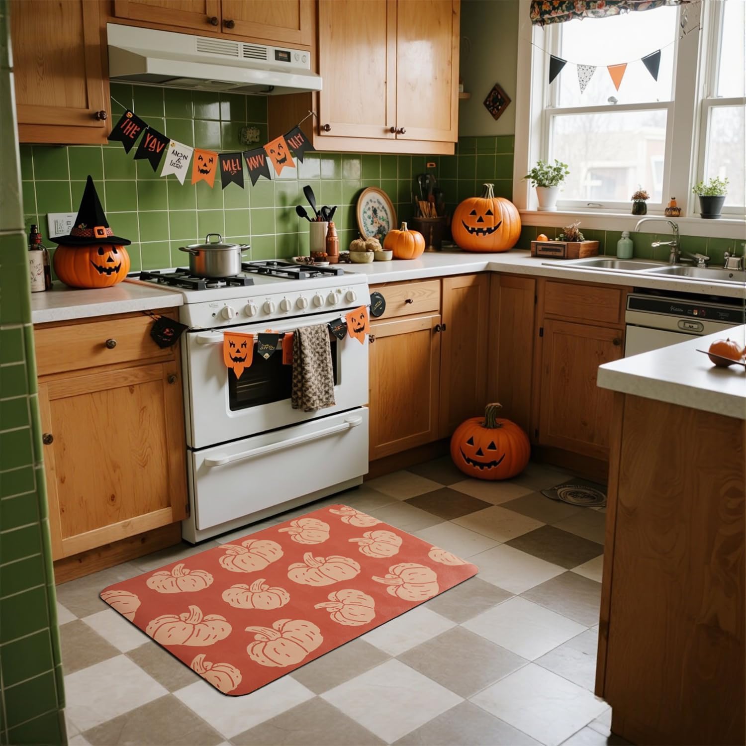 Halloween Bath Mat, Thin Halloween Bathroom Rug Non-Slip Quick Dry Pumpkin Bath Mat Fits Under Door Thin Floor Mat Fall Halloween Decor, 17’’x30‘’, Pumpkins Orange