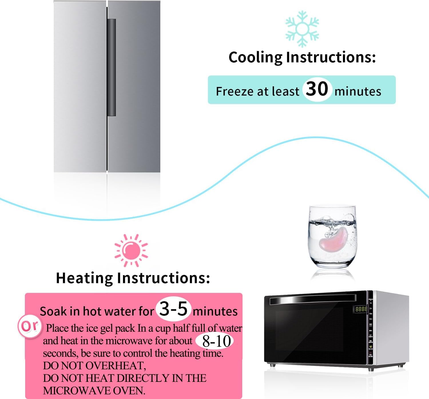 - Cold & Hot Compress: Simply place the gel eye pads in the refrigerator or hot water/microwave until the desired temperature is reached. Note: Refrigerate for 20-30 minutes. Heat: soak in hot water for 3-5 minutes or place the ice gel pack In a cup half full of water and heat in the microwave for about 8-10 seconds, be sure to control the heating time, DO NOT OVERHEAT, DO NOT HEAT DIRECTLY IN THE MICROWAVE OVEN.