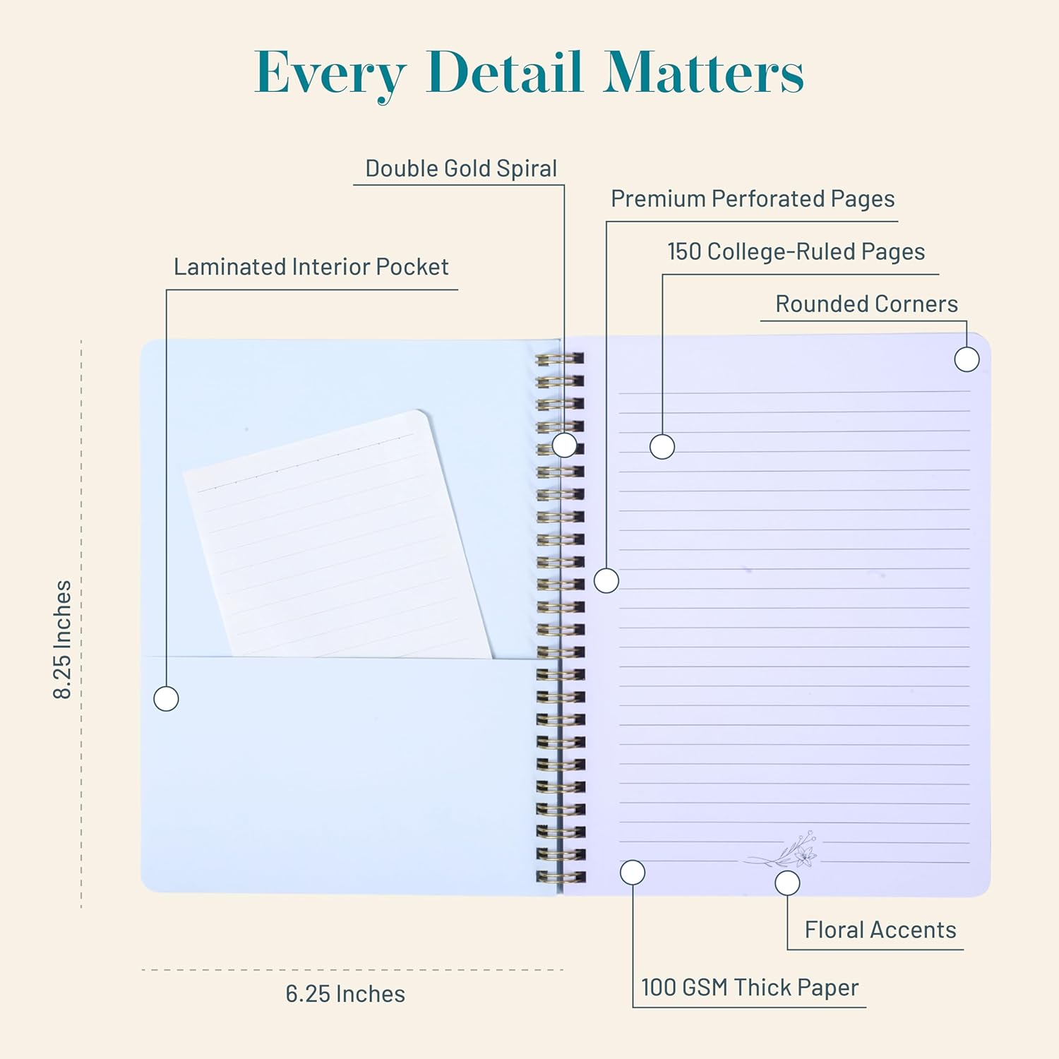- Durable Stylish Cover: The durable spiral binding keeps pages secure while allowing our hard cover notebook to lay Tlat for smooth writing. Its pretty cover, combined with laminated interior pocket, adds style and functionality.