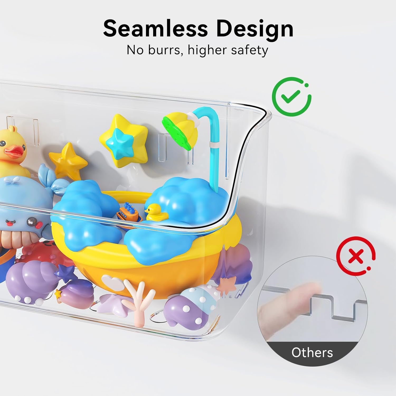 - SEAMLESS DESIGN: Seamless, burr-free design for safer accessing; and this bath toy organizer features super-strong adhesive for a secure fit. Once properly installed, there's no need to worry about it falling.