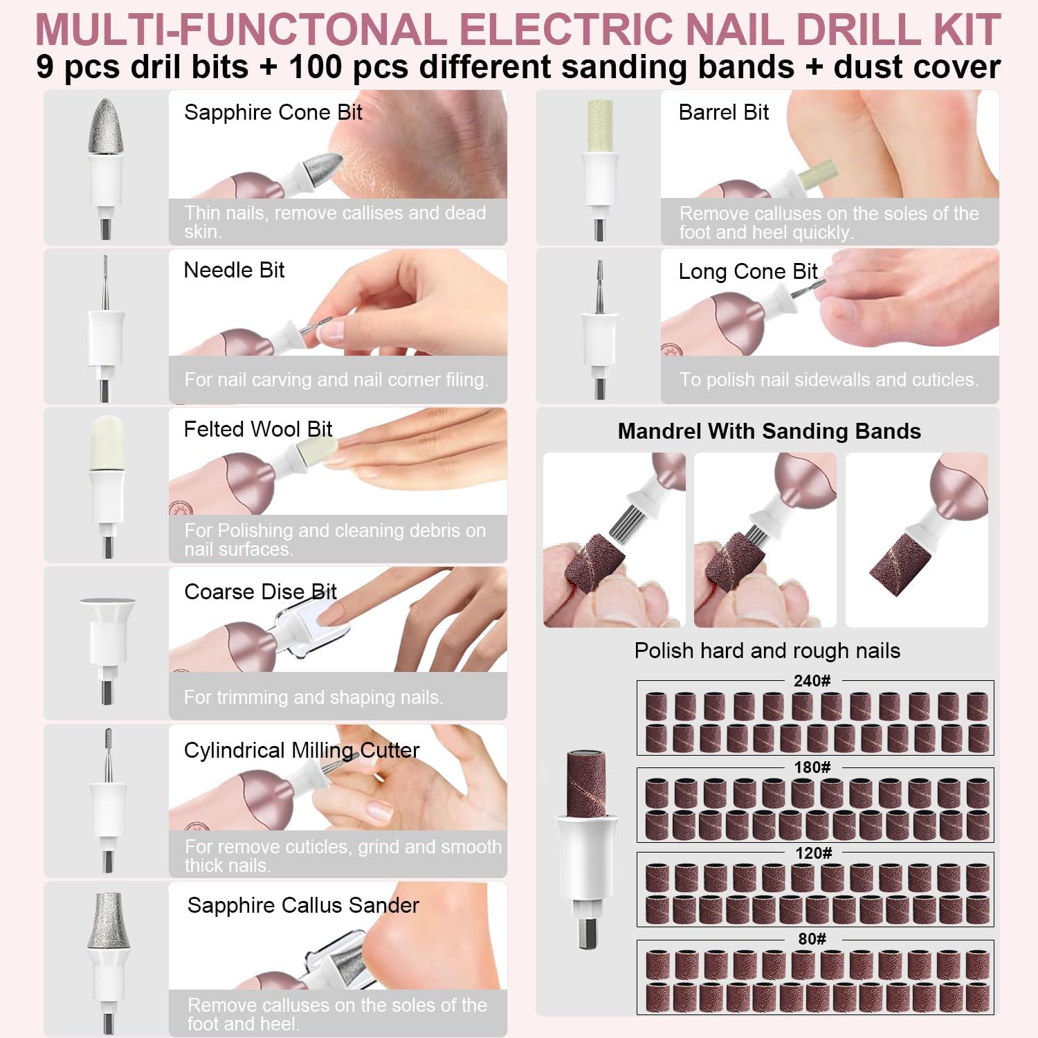 4 Pack 9-in-1 Nail Grinder Kit Salon-Quality Nails with 100 Bits, Cordless Nail File, 5 Adjustable Speeds,Pink