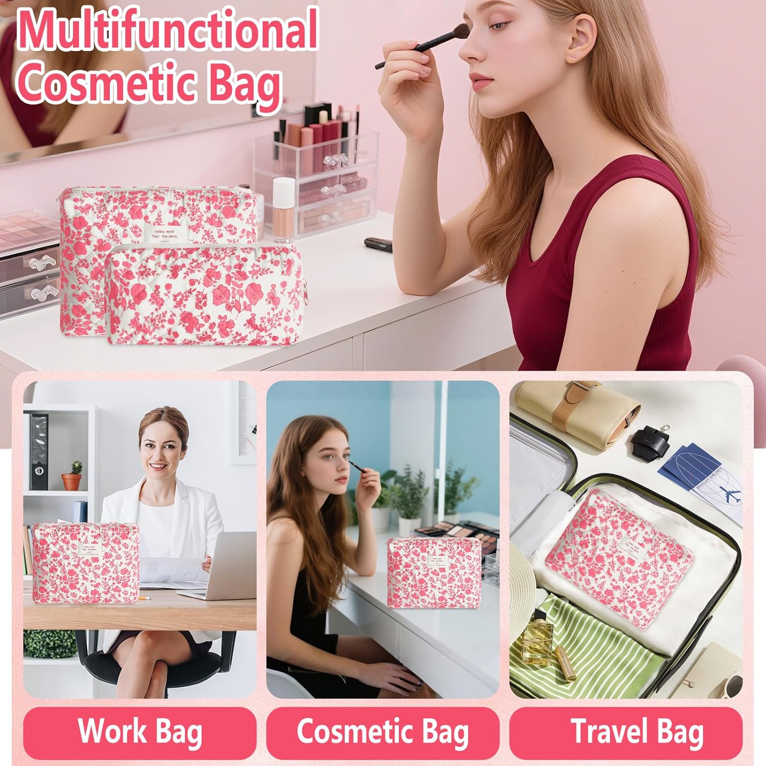2Pcs Quilted Makeup Bag Set Flower Cute Pencil Case Large Small Travel Makeup Pouch Set for Women Coquette Makeup Bag Aesthetic Cotton Cosmetic Bag Pink Toiletry Organizer Storage Bag Big Zipper Pouch