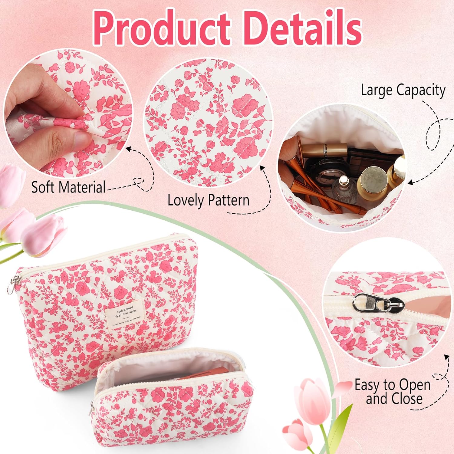 - TRAVEL MAKEUP BAG SET COQUETTE FOR WOMEN:You will get a large makeup bag and a small cosmetic bag (makeup brush bag).These floral makeup pouch is lovely and fashionable, the texture is lightweight and soft. These floral makeup pouch is cute and fashionable, lightweight and soft, easy to carry.Cute flower pencil case,pink pencil pouch