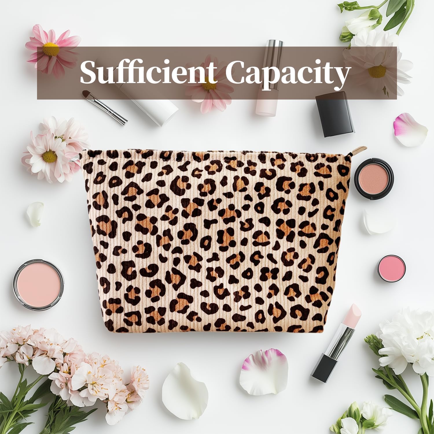 Leopard Print Corduroy Makeup Bag for Women – Soft Cosmetic Travel Pouch with Zipper Closure, Large Toiletry Organizer with Lining, Stylish Animal Print Makeup Case for Purse or Travel