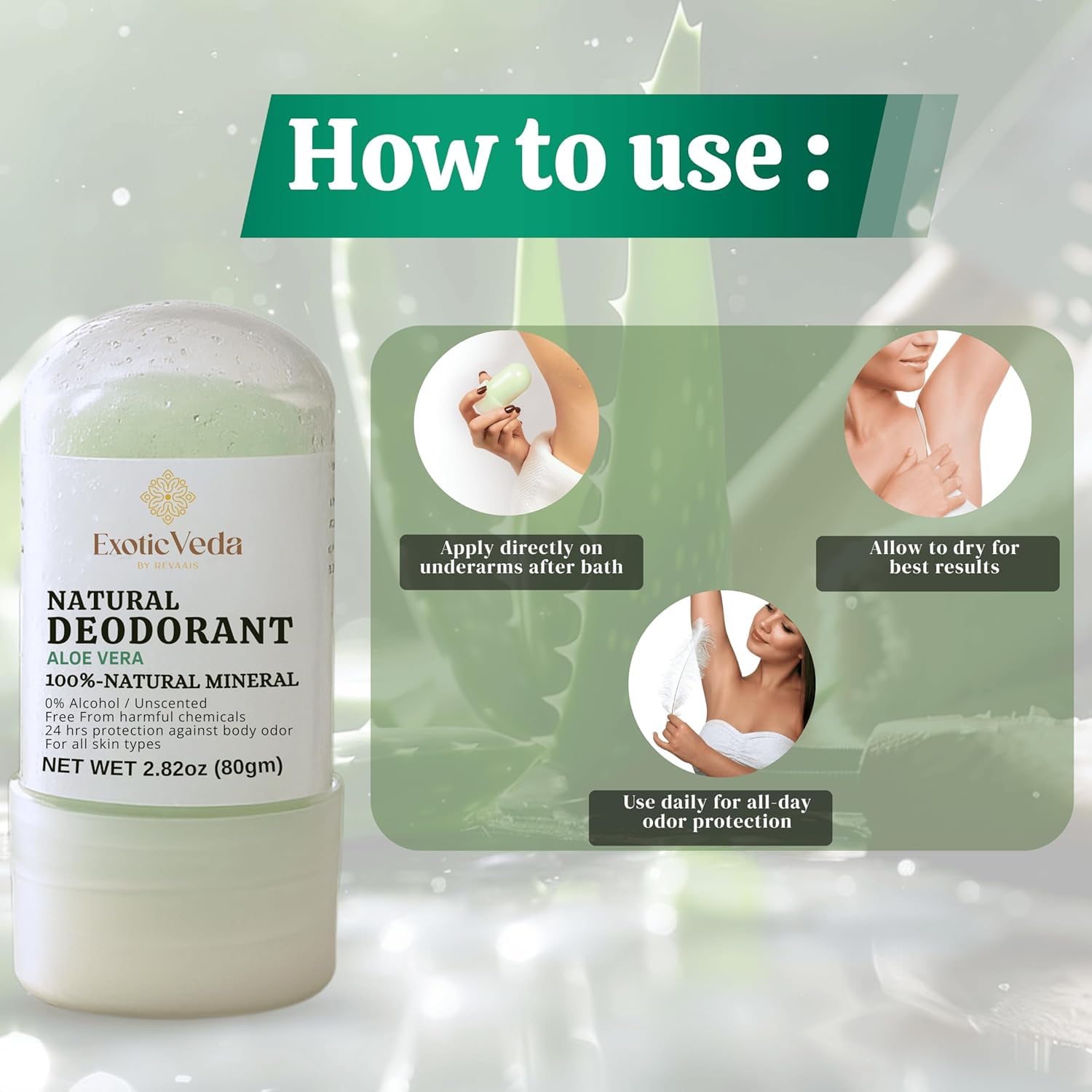 - Natural Deodorant with Alum & Aloe Vera - Experience long-lasting freshness with Exotic Veda Alum Aloe Vera Deodorant Stick, crafted with 100% natural mineral alum and soothing aloe vera. This powerful combination helps control odor while calming and hydrating delicate underarm skin. Unlike chemical deodorants, it protects without irritation or clogging pores. Perfect for sensitive skin, it offers a natural, safe, and effective solution for daily odor control, keeping you confident, comfortable, and fresh throughout the day in every activity.
